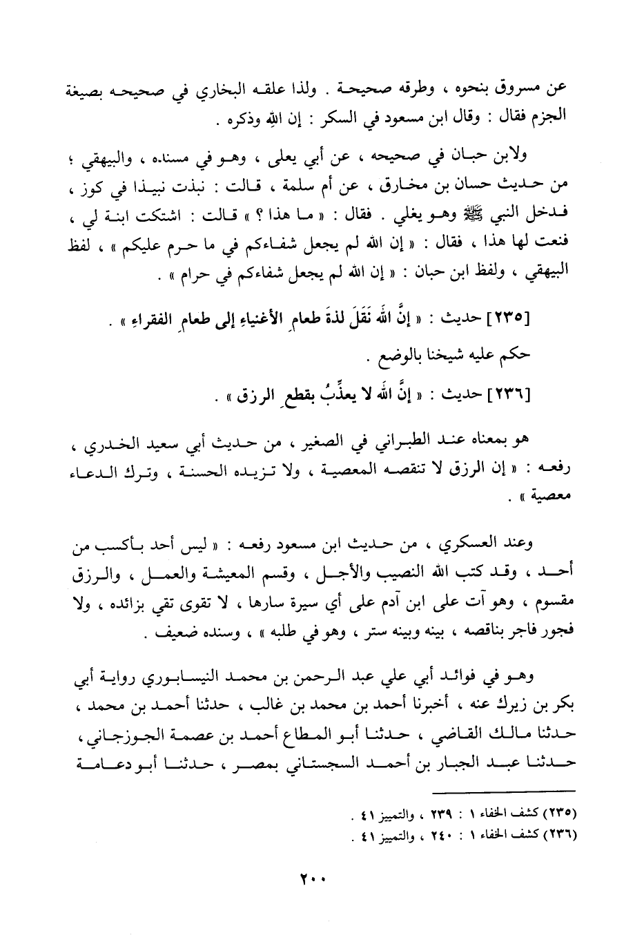 236 - حَدِيث: إِنَّ اللَّه لا يُعَذِّبُ بِقَطْعِ الرِّزْقِ، هو بمعناه عند الطبراني في الصغير من حديث أبي سعيد الخدري رفعه: إن الرزق لا تنقصه المعصية، ولا تزيده الحسنة، وترك الدعاء معصية، وعند العسكري من حديث ابن مسعود رفعه: ليس أحد بأكسب من أحد. وقد كتب اللَّه النصيب والأجل، وقسم المعيشة والعمل، والرزق مقسوم، وهو آت على ابن آدم، على أي سيرة سارها، لا تقوى تقي بزائده، ولا فجور فاجر بناقصه، بينه وبينه ستر وهو في طلبه. وسنده ضعيف. وهو في فوائد أبي علي عبد الرحمن بن محمد النيسابوري رواية أبي بكر بن زيرك عنه، أخبرنا أحمد بن محمد بن غالب، حدثنا أحمد بن محمد، حدثنا مالك القاضي حدثنا أبو المطاع أحمد بن عصمة الجوزجاني حدثنا عبد الجبار بن أحمد السجستاني. بمصر حدثنا أبو دعامة