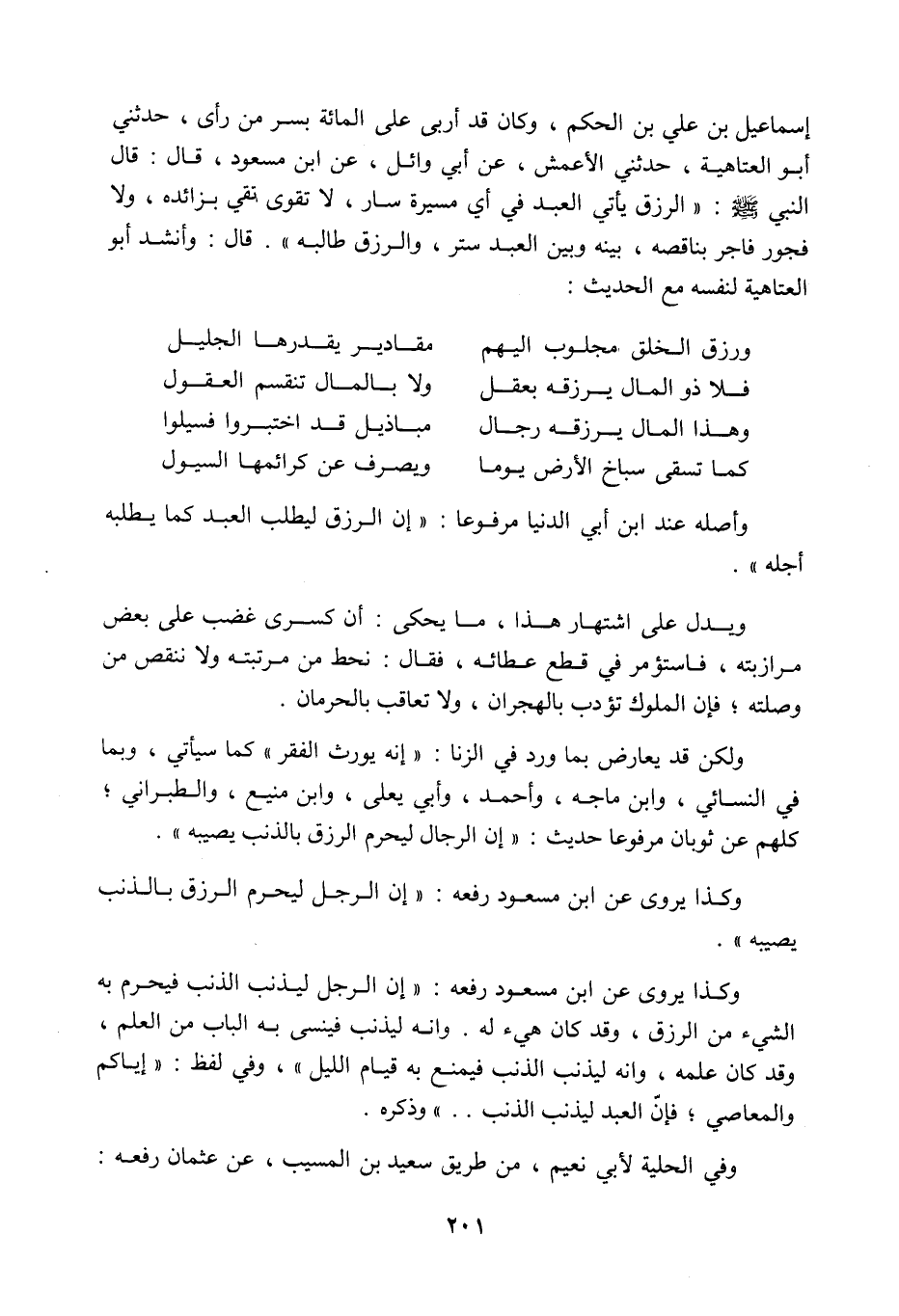 إسماعيل بن علي بن الحكم. وكان قد أربى على المائة بسر من رأى. حدثني أبو العتاهية، حدثني الأعمش، عن أبي وائل عن ابن مسعود، قال: قال النبي صَلَّى اللَّهُ عَلَيْهِ وَسَلَّمَ: الرزق يأتي العبد في أي مسيرة سار لا تقوى متق بزائده، ولا فجور فاجر بناقصه، بينه وبين العبد ستر، والرزق طالبه (¬1) . قال: وأنشد أبو العتاهية لنفسه مع الحديث: