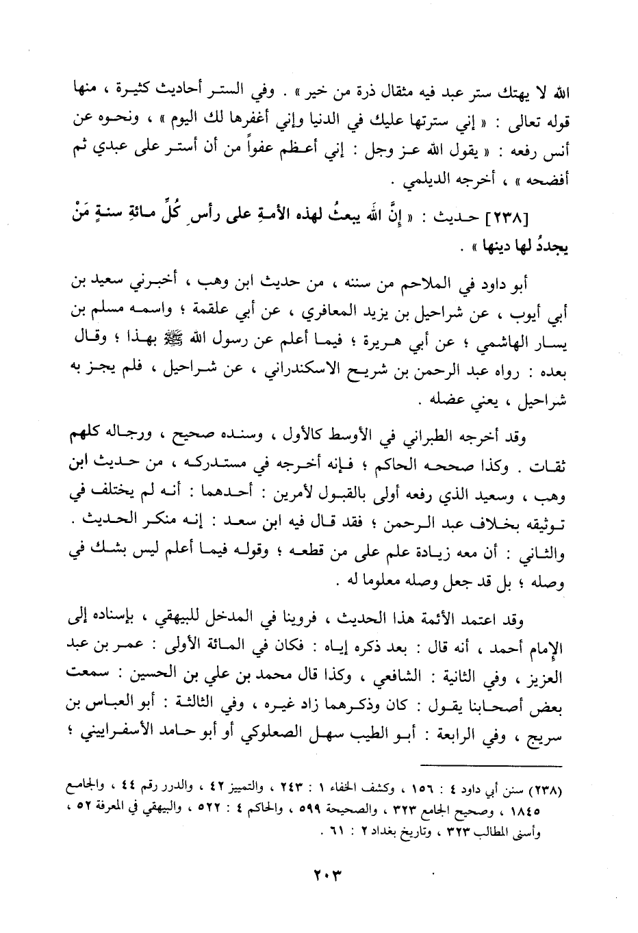 238 - حَدِيث: إِنَّ اللَّه يَبْعَثُ لِهَذِهِ الأُمَّةِ عَلَى رَأْسِ كُلِّ مِائَةِ سَنَةٍ مَنْ يُجَدِّدُ لَهَا دِينَهَا، أبو داود في الملاحم من سننه من حديث ابن وهب، أخبرني سعيد بن أبي أيوب عن شراحيل بن يزيد المعافري عن أبي علقمة، واسمه مسلم بن يسار الهاشمي عن أبي هريرة فيما أعلم عن رسول اللَّه صَلَّى اللَّهُ عَلَيْهِ وَسَلَّمَ بهذا، وقال بعده: رواه عبد الرحمن بن شريح الإسكندراني عن شراحيل فلم يجز به شراحيل، يعني عضله، وقد أخرجه الطبراني في الأوسط كالأول وسنده صحيح، ورجاله كلهم ثقات، وكذا صححه الحاكم، فإنه أخرجه في مستدركه من حديث ابن وهب، وسعيد الذي رفعه أولى بالقبول لأمرين: أحدهما: أنه لم يختلف في توثيقه بخلاف عبد الرحمن فقد قال فيه ابن سعد: إنه منكر الحديث، والثاني: أن معه زيادة علم على من قطعه، وقوله فيما أعلم ليس بشك في وصله، بل قد جعل وصله معلوما له، وقد اعتمد الأئمة هذا الحديث، فروينا في المدخل للبيهقي بإسناده إلى الإمام أحمد، أنه قال بعد ذكره إياه: فكان في المائة الأولى عمر بن عبد العزيز، وفي الثانية الشافعي، وكذا قال محمد بن علي بن الحسين سمعت بعض أصحابنا يقول: كان، وذكرهما، زاد غيره: وفي الثالثة أبو العباس بن سريج، وفي الرابعة أبو الطيب سهل الصعلوكي، أو أبو حامد الأسفراييني،