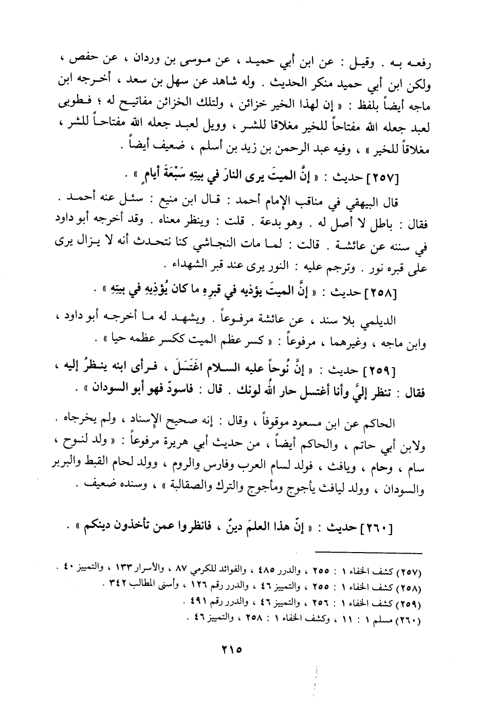 257 - حديث: إن الميت يرى النار في بيته سبعة أيام، قال البيهقي في مناقب الإمام أحمد: قال ابن منيع: سئل عنه أحمد، فقال: باطل لا أصل له، وهو بدعة. قلت: وينظر معناه، وقد أخرجه أبو داود في سننه عن عائشة، قالت: لما مات النجاشي كنا نتحدث أنه لا يزال يرى على قبره نور. وترجم عليه: النور يرى عند قبر الشهداء.
