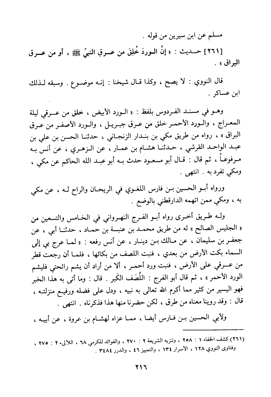 261 - حَدِيث: إِنَّ الْوَرْدَ خُلِقَ مِنْ عَرَقِ النَّبِيِّ صَلَّى اللَّهُ عَلَيْهِ وَسَلَّمَ، أَوْ مِنْ عَرَقِ الْبُرَاقِ، قال النووي: لا يصح، وكذا قال شيخنا: إنه موضوع، وسبقه لذلك ابن عساكر، وهو في مسند الفردوس، بلفظ: الورد الأبيض خلق من عرقي ليلة المعراج، والورد الأحمر خلق من عرق جبريل، والورد الأصفر من عرق البراق، رواه من طريق مكي بن بندار الزنجاني، حدثنا الحسن بن علي بن عبد الواحد القرشي، حدثنا هشام بن عمار عن الزهري، عن أنس به مرفوعا، ثم قال: قال أبو مسعود: حدث به أبو عبد اللَّه الحاكم عن مكي، ومكي تفرد به، انتهى. ورواه أبو الحسين ابن فارس اللغوي في الريحان والراح له، عن مكي به، ومكي ممن اتهمه الدارقطني بالوضع، وله طريق أخرى رواه أبو الفرج النهرواني في الخامس والتسعين من "الجليس الصالح" له من طريق محمد بن عنبسة بن حماد، حدثنا أبي عن جعفر بن سليمان عن مالك بن دينار، عن أنس، رفعه: لما عرج بي إلى السماء بكت الأرض من بعدي، فنبت اللصف من بكائها، فلما أن رجعت قطر من عرقي على الأرض، فنبت ورد أحمر، ألا من أراد أن يشم رائحتي فليشم الورد الأحمر، ثم قال أبو الفرج: اللَّصَف الكَبر، قال: وما أتى به هذا الخبر فهو اليسير من كثير مما أكرم اللَّه تعالى به نبيه، ودل على فضله ورفيع منزلته، قال: وقد روينا معناه من طرق، لكن حضرنا منها هذا فذكرناه، انتهى. ولأبي الحسين ابن فارس أيضا مما عزاه لهشام بن عروة عن أبيه