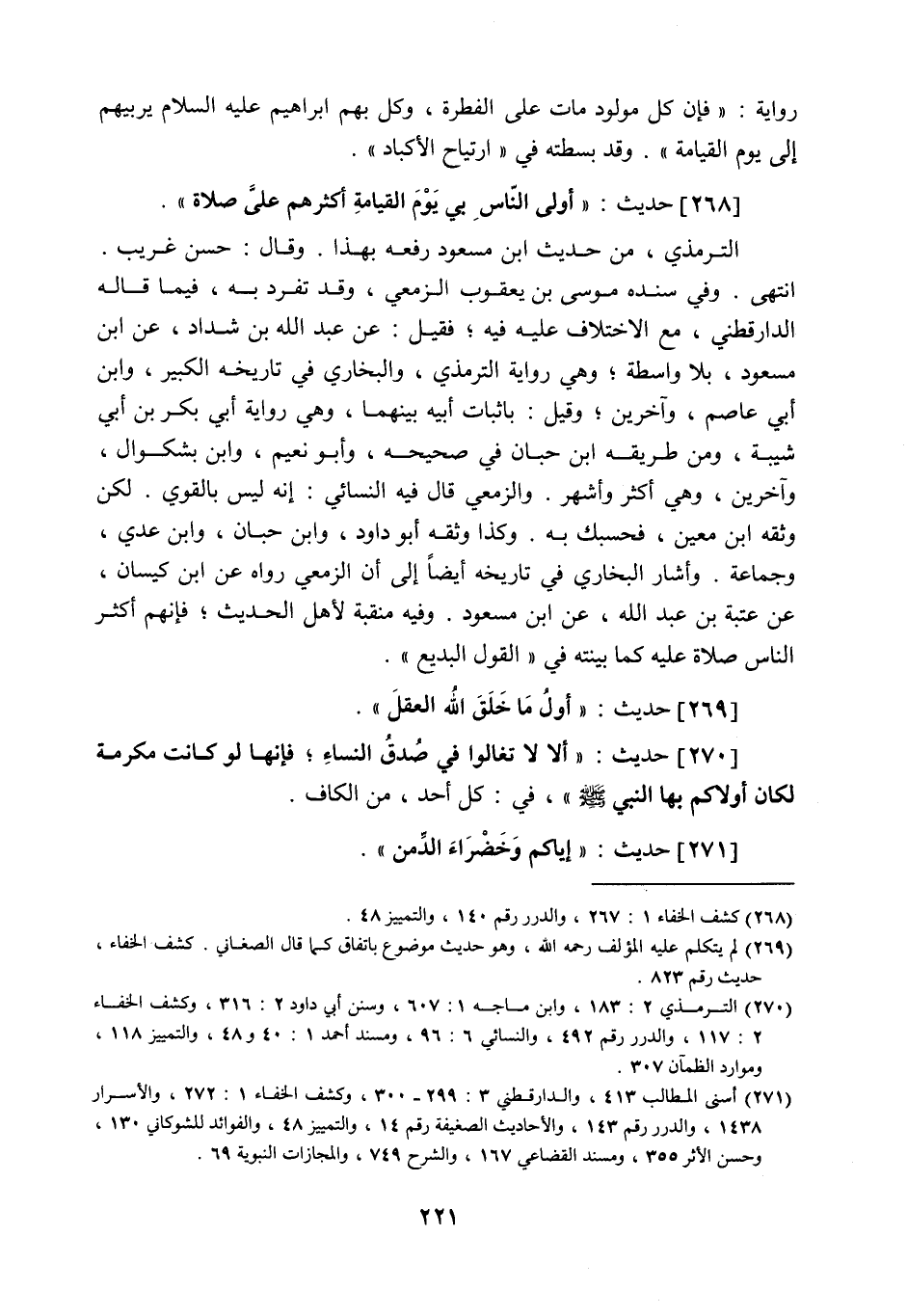 268 - حَدِيث: أَوْلَى النَّاسِ بِي يَوْمَ الْقِيَامَةِ أَكْثَرُهُمْ عليَّ صَلاةً، الترمذي من حديث ابن مسعود رفعه بهذا، وقال: حسن غريب، انتهى. وفي سنده موسى بن يعقوب الزمعي، وقد تفرد به فيما قاله الدارقطني مع الاختلاف عليه فيه، فقيل عن عبد اللَّه بن شداد عن ابن مسعود بلا واسطة، وهي رواية الترمذي، والبخاري في تاريخه الكبير، وابن أبي عاصم وآخرين. وقيل: بإثبات أبيه بينهما. وهي رواية أبي بكر ابن أبي شيبة، ومن طريقه ابن حبان في صحيحه، وأبو نُعيم، وابن بشكوال، وآخرين. وهي أكثر وأشهر، والزمعي قال فيه النسائي: إنه ليس بالقوي، لكن وثقه ابن معين فحسبك به، وكذا وثقه أبو داود، وابن حبان، وابن عدي، وجماعة، وأشار البخاري في تاريخه أيضا إلى أن الزمعي رواه عن ابن كيسان. عن عتبة بن عبد اللَّه عن ابن مسعود، وفيه منقبة لأهل الحديث، فإنهم أكثر الناس صلاة عليه، كما بينته في "القول البديع".