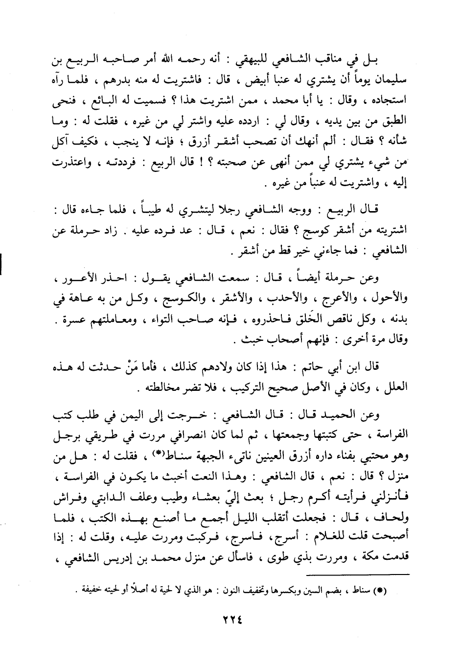 بل في مناقب الشافعي للبيهقي أنه رحمه اللَّه أمر صاحبه الربيع بن سليمان يوما أن يشتري له عنبا أبيض، قال: فاشتريت له منه بدرهم، فلما رآه استجاده، وقال: يا أبا محمد ممن اشتريت هذا؟ فسميت له البائع، فنحى الطبق من بين يديه، وقال لي: اردده عليه، واشتر لي من غيره، فقلت له: وما شأنه؟ فقال: ألم أنهك أن تصحب أشقر أزرق، فإنه لا ينجب، فكيف آكل من شيء يشترى لي ممن أنهى عن صحبته، قال الربيع: فرددته واعتذرت إليه واشتريت له عنبا من غيره، قال الربيع: ووجه الشافعي رجلا ليشتري له طيبا، فلما جاءه قال: اشتريته من أشقر كوسج؟ فقال: نعم، قال: عد فرده عليه، زاد حرملة عن الشافعي: فما جاءني خير قط من أشقر، وعن حرملة أيضا، قال: سمعت الشافعي يقول: احذر الأعور، والأحول، والأعرج، والأحدب، والأشقر، والكوسج، وكل من به عاهة في بدنه، وكل ناقص الخَلق فاحذره، فإنه صاحب التواء، ومعاملتهم عسرة، وقال مرة أخرى: فإنهم أصحاب خبث، قال ابن أبي حاتم: هذا إذا كان ولادتهم كذلك، فأما من حدثت له هذه العلل، وكان في الأصل صحيح التركيب فلا تضر مخالطته، وعن الحميدي قال: قال الشافعي: خرجت إلى اليمن في طلب كتب الفراسة، حتى كتبتها وجمعتها، ثم لما كان انصرافي مررت في طريقي برجل، وهو محتبي بفناء داره، أزرق العينين، ناتئ الجبهة، سناط (¬1) فقلت له: هل من منزل؟ قال: نعم، قال الشافعي: وهذا النعت أخبث ما يكون في الفراسة، فأنزلني، فرأيته أكرم رجل، بعث إليَّ بعشاء، وطيب، وعلف لدابتي، وفراش، ولحاف، قال: فجعلت أتقلب الليل، أجمع ما أصنع بهذه الكتب، فلما أصبحت قلت للغلام: أسرج فأسرج، فركبت ومررت عليه، وقلت له: إذا قدمت مكة، ومررت بذي طوى، فاسأل عن منزل محمد بن إدربس الشافعي،