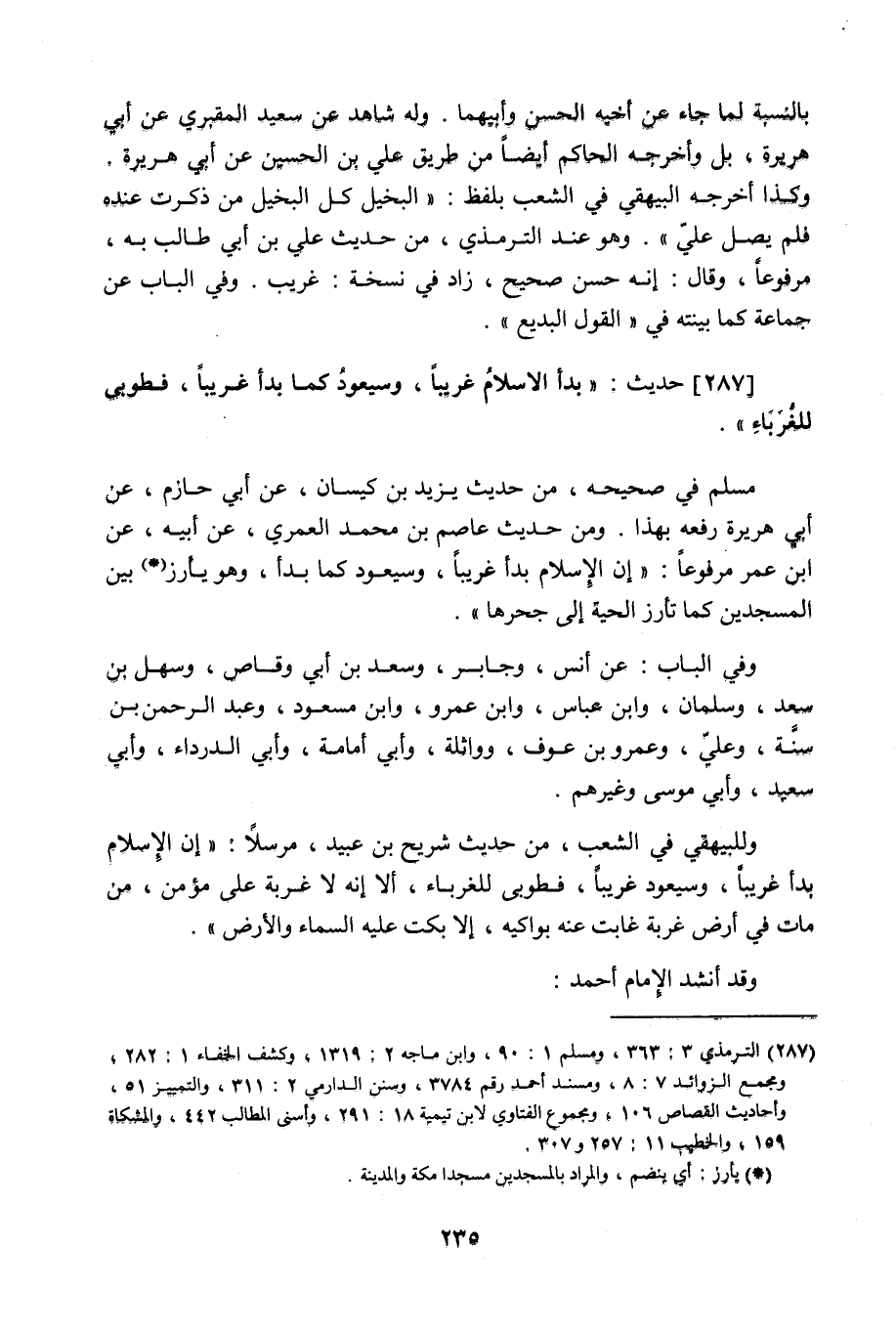 287 - حَدِيث: بَدَأَ الإِسْلامُ غَرِيبًا، وَسَيَعُودُ كَمَا بَدَأَ غَرِيبًا، فَطُوبَى لِلْغُرَبَاءِ، مسلم في صحيحه من حديث يزيد بن كيسان، عن أبي حازم عن أبي هريرة رفعه بهذا، ومن حديث عاصم بن محمد العمري عن أبيه عن ابن عمر مرفوعا: إن الإسلام بدأ غريبا، وسيعود كما بدأ، وهو يأرز (¬1) بين المسجدين، كما تأرز الحية إلى جحرها، وفي الباب عن أنس، وجابر، وسعد بن أبي وقاص، وسهل بن سعد، وسلمان، وابن عباس، وابن عمرو، وابن مسعود، وعبد الرحمن ابن سنَّة وعلي، وعمرو بن عوف، وواثلة، وأبي أمامة، وأبي الدرداء، وأبي سعيد، وأبي موسى، وغيرهم (¬2) ، وللبيهقي في الشعب من حديث شريح بن عبيد مرسلا: إن الإسلام بدأ غريبا، وسيعود غريبا، فطوبى للغرباء، ألا إنه لا غربة على مؤمن، من مات في أرض غربة غابت عنه بواكيه، إلا بكت عليه السماء والأرض، وقد أنشد الإمام أحمد: