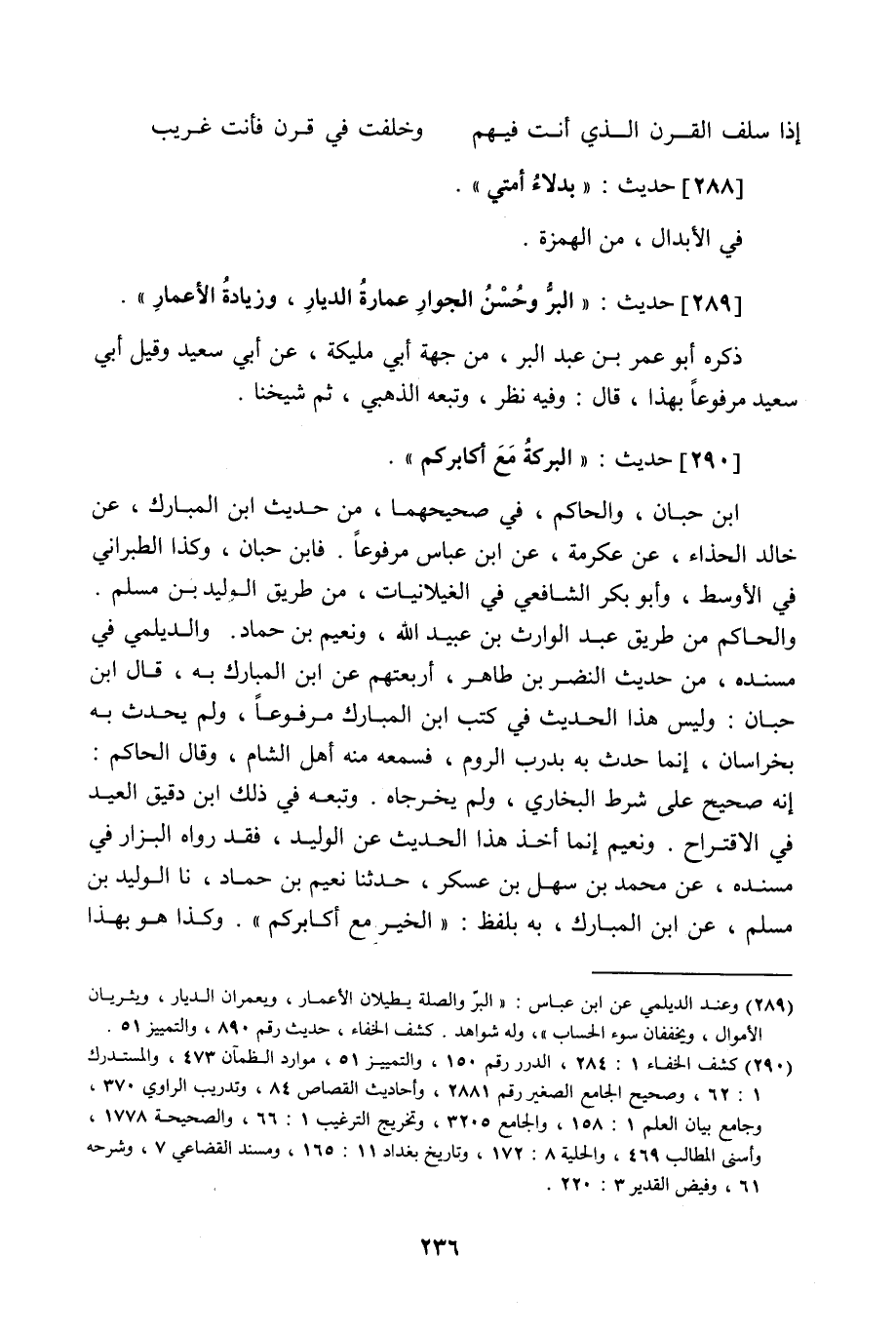 290 - حَدِيث: الْبَرَكَةُ مَعَ أَكَابِرِهِمْ، ابن حبان والحاكم في صحيحهما، من حديث ابن المبارك عن خالد الحذاء عن عكرمة عن ابن عباس مرفوعا، فابن حبان، وكذا الطبراني في الأوسط، وأبو بكر الشافعي في الغيلانيات، من طريق الوليد ابن مسلم، والحاكم من طريق عبد الوارث بن عبيد اللَّه، ونعيم بن حماد، والديلمي في مسنده من حديث النضر بن طاهر، أربعتهم عن ابن المبارك به، قال ابن حبان: وليس هذا الحديث في كتب ابن المبارك مرفوعا، ولم يحدث به بخراسان، إنما حدث به بدرب الروم، فسمعه منه أهل الشام، وقال الحاكم: إنه صحيح على شرط البخاري، ولم يخرجاه، وتبعه في ذلك ابن دقيق العيد في الاقتراح، ونعيم إنما أخذ هذا الحديث عن الوليد، فقد رواه البزار في مسنده عن محمد بن سهل بن عسكر حدثنا نعيم بن حماد نا الوليد بن مسلم، عن ابن مبارك به، بلفظ: الخير مع أكابرهم، وكذا هو بهذا