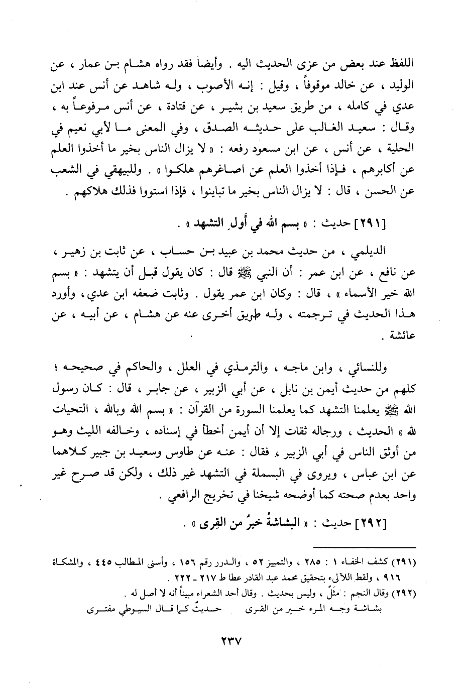 291 - حَدِيث: بِسْمِ اللَّه فِي أَوَّلِ التَّشَهُّدِ، الديلمي من حديث محمد بن عبيد بن حسابٍ، عن ثابت بن زهير عن نافع، عن ابن عمر أن النبي صَلَّى اللَّهُ عَلَيْهِ وَسَلَّمَ قال: كان يقول قبل أن يتشهد: بسم اللَّه خير الأسماء، قال: وكان ابن عمر يقوله، وثابت ضعفه ابن عدي، وأورد هذا الحديث في ترجمته، وله طريق أخرى عنه عن هشام، عن أبيه، عن عائشة، وللنسائي وابن ماجه والترمذي في العلل، والحاكم في صحيحه، كلهم من حديث أيمن بن نابل، عن أبي الزبير، عن جابر قال: كان رسول اللَّه صَلَّى اللَّهُ عَلَيْهِ وَسَلَّمَ يعلمنا التشهد كما يعلمنا السورة من القرآن: بسم اللَّه وباللَّه، التحيات للَّه، الحديث، ورجاله ثقات، إلا أن أيمن أخطأ في إسناده، وخالفه الليث وهو من أوثق الناس في أبي الزبير، فقال: عنه عن طاوس وسعيد بن جبير، كلاهما عن ابن عباس، ويروى في البسملة في التشهد غير ذلك، ولكن قد صرح غير واحد بعدم صحته، كما أوضحه شيخنا في تخريج الرافعي.