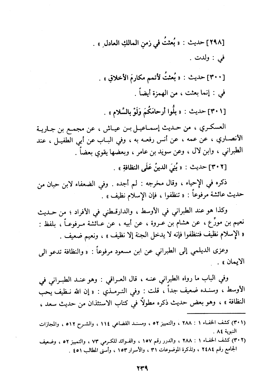 302 - حَدِيث: بُنِيَ الدِّينُ عَلَى النَّظَافَةِ، ذكره في الإحياء، وقال مخرجه: لم أجده، وفي الضعفاء لابن حبان من حديث عائشة مرفوعا: تنظفوا، فإن الإسلام نظيف، وكذا هو عند الطبراني في الأوسط، والدارقطني في الأفراد من حديث نعيم بن مورِّع، عن هشام بن عروة، عن أبيه، عن عائشة مرفوعا، بلفظ: الإسلام نظيف فتنظفوا، فإنه لا يدخل الجنة إلا نظيف، ونعيم ضعيف، وعزى الديلمي إلى الطبراني عن ابن مسعود، مرفوعا: والنظافة تدعو إلى الإيمان، وفي الباب ما رواه الطبراني عنه، قال العراقي: وهو عند الطبراني في الأوسط، وسنده ضعيف جدا، قلت: وفي الترمذي: إن اللَّه نظيف يحب النظافة، وهو بعض حديث ذكره مطولا في كتاب الاستئذان من حديث سعد،