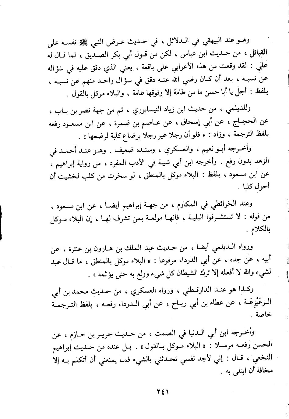 وهو عند البيهقي في الدلائل في حديث: عرض النبي صَلَّى اللَّهُ عَلَيْهِ وَسَلَّمَ نفسه على القبائل من حديث ابن عباس، لكن من قول أبي بكر الصديق، لما قال له علي: لقد وقعت من هذا الأعرابي على باقعة، يعني الذي دقق عليه في سؤاله عن نسبه، بعد أن كان رضي اللَّه عنه دقق في سؤال واحد منهم عن نسبه، بلفظ: أجل يا أبا حسن، ما من طامة إلا وفوقها طامة، والبلاء موكل بالقول، وللديلمي من حديث ابن زياد النيسابوري، ثم من جهة نصر بن باب عن الحجاج، عن أبي إسحاق عن عاصم بن ضمرة عن ابن مسعود رفعه بلفظ الترجمة، وزاد: فلو أن رجلا عير رجلا برضاع كلبة لرضعها، وأخرجه أبو نُعيم، والعسكري، وسنده ضعيف، وهو عند أحمد في الزهد بدون رفع، وأخرجه ابن أبي شيبة في الأدب المفرد من رواية إبراهيم عن ابن مسعود، بلفظ: البلاء موكل بالمنطق، لو سخرت من كلب، لخشيت أن أحول كلبا، وعند الخرائطي في المكارم من جهة إبراهيم أيضا عن ابن مسعود من قوله: لا تستشرفوا البلية، فإنها مولعة بمن تشرف لها، إن البلاء موكل بالكلام، ورواه الديلمي أيضا من حديث عبد الملك بن هارون بن عنترة عن أبيه عن جده عن أبي الدرداء مرفوعا: البلاء موكل بالمنطق، ما قال عبد لشيء: واللَّه لا أفعله، إلا ترك الشيطان كل شيء، وولع به حتى يؤثمه، وكذا هو عند الدارقطني، ورواه العسكري من حديث محمد بن أبي الزعَيْزِعَة عن عطاء بن أبي رباح عن أبي الدرداء رفعه بلفظ الترجمة خاصة، وأخرجه ابن أبي الدنيا في الصمت من حديث جرير بن حازم عن الحسن رفعه مرسلا: البلاء موكل بالقول، بل عنده من حديث إبراهيم النخعي، قال: إني لأجد نفسي تحدثني بالشيء فما يمنعني أن أتكلم به إلا مخافة أن أُبتلي به،