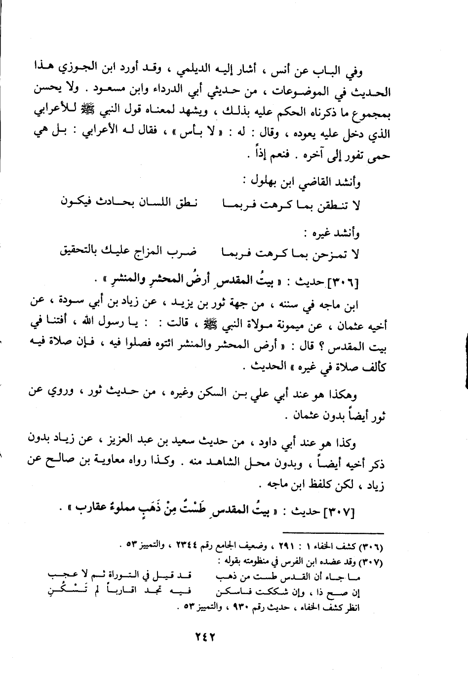 306 - حَدِيث: بَيْتُ الْمَقْدِسِ أَرْضُ الْمَحْشَرِ وَالْمَنْشَرِ، ابن ماجه في سننه من جهة ثور بن يزيد عن زياد بن أبي سودة عن أخيه عثمان عن ميمونة مولاة النبي صَلَّى اللَّهُ عَلَيْهِ وَسَلَّمَ، قالت: قلت يا رسول اللَّه، أفتنا في بيت المقدس؟ قال: أرض المحشر والمنشر، ائتوه فصلوا فيه، فإن صلاة فيه كألف صلاة في غيره، الحديث، وهكذا هو عند أبي علي ابن السكن وغيره من حديث ثور، وروي عن ثور أيضا بدون عثمان، وكذا هو عند أبي داود من حديث سعيد بن عبد العزيز عن زياد بدون ذكر أخيه أيضا، وبدون محل الشاهد منه، وكذا رواه معاوية بن صالح عن زياد، لكن كلفظ ابن ماجه.