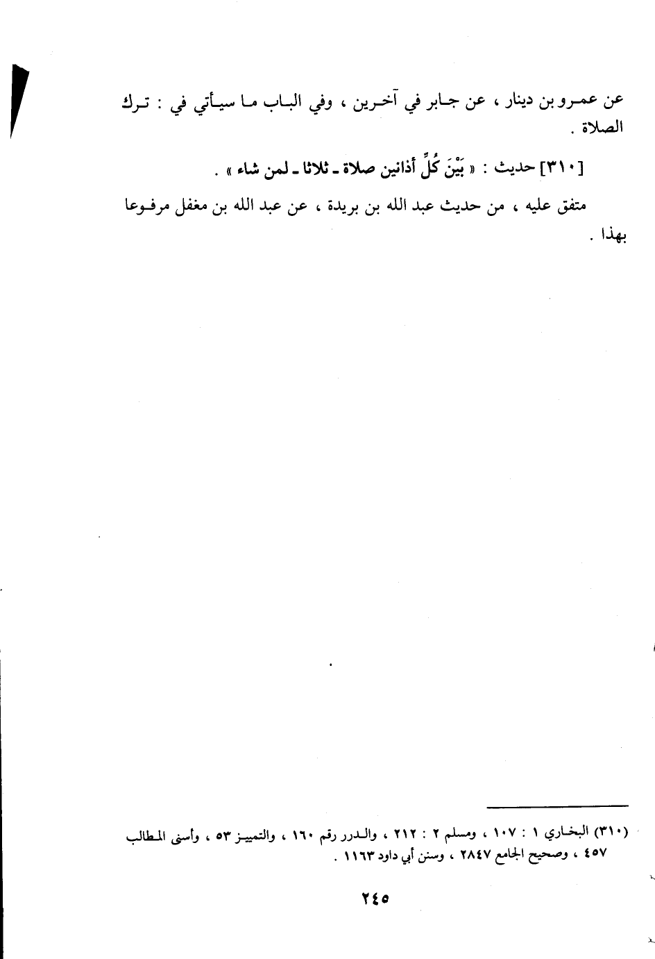 310 - حَدِيث: بَيْنَ كُلِّ أَذَانَيْنِ صَلاةٌ، ثَلاثًا، لِمَنْ شَاءَ، متفق عليه من حديث عبد اللَّه بن بريدة، عن عبد اللَّه بن مغفل مرفوعا بهذا.