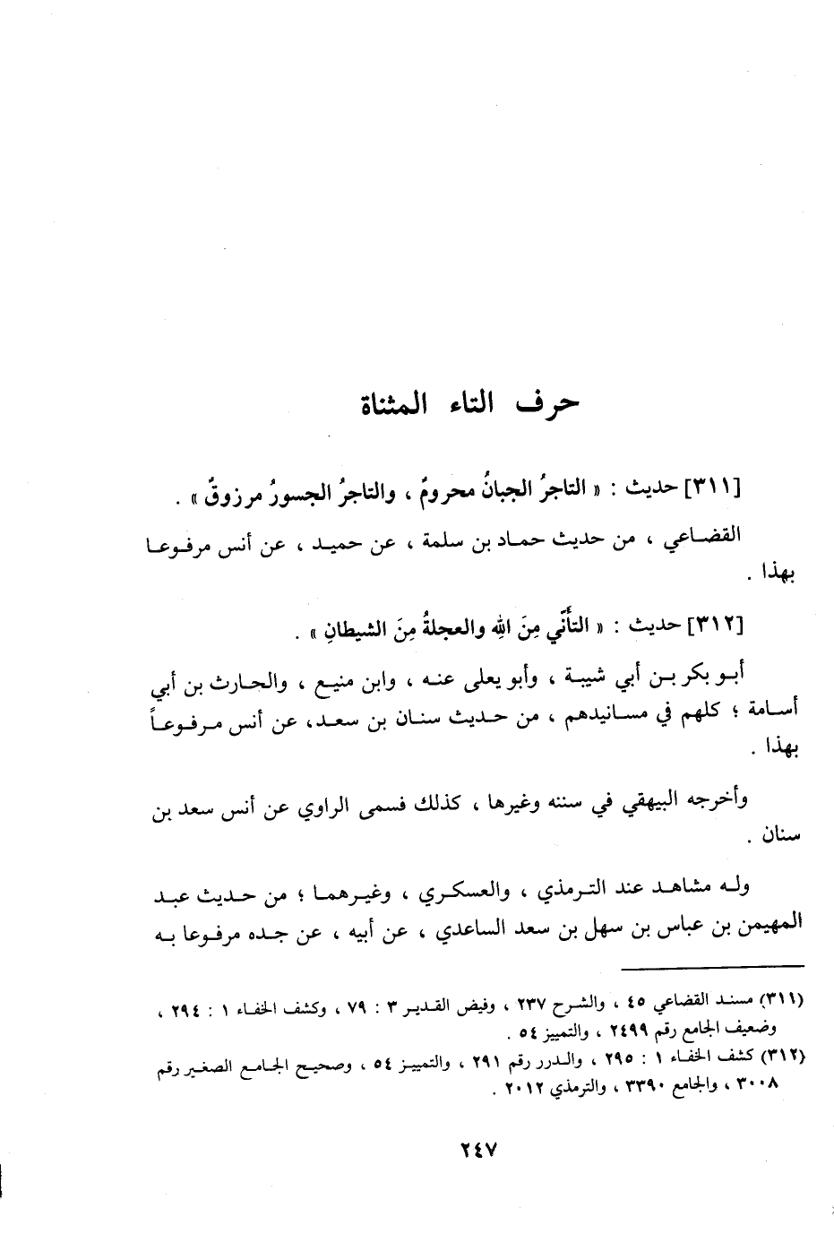 312 - حَدِيث: التَّأَنِّي مِنَ اللَّه وَالْعَجَلَةُ مِنَ الشَّيْطَانِ، أبو بكر ابن أبي شيبة، وأبو يعلى عنه، وابن منيع، والحارث ابن أبي أسامة، كلهم في مسانيدهم من حديث سنان بن سعد، عن أنس مرفوعا بهذا، وأخرجه البيهقي في سننه وغيرها، كذلك فسمى الراوي عن أنس سعد بن سنان، وله شاهد عند الترمذي، والعسكري، وغيرهما، من حديث عبد المهيمن بن عباس بن سهل بن سعد الساعدي، عن أبيه عن جده مرفوعا به