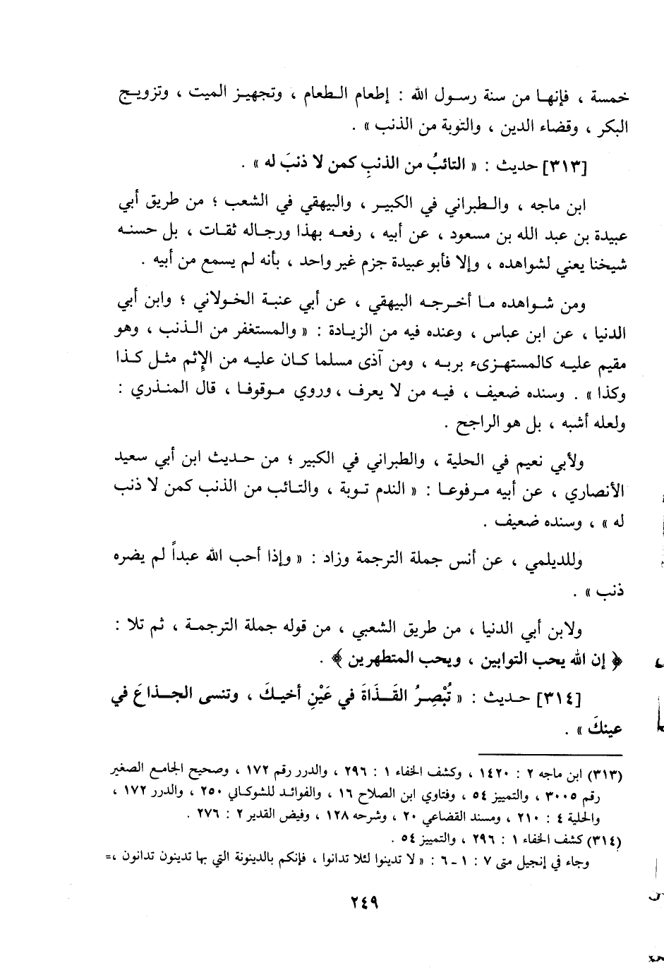 313 - حَدِيث: التَّائِبُ مِنَ الذَّنْبِ كَمَنْ لا ذَنْبَ لَهُ، ابن ماجه، والطبراني في الكبير، والبيهقي في الشعب، من طريق أبي عبيدة بن عبد اللَّه بن مسعود عن أبيه، رفعه بهذا، ورجاله ثقات، بل حسنه شيخنا يعني لشواهده، والا فأبو عبيدة جزم غير واحد، بأنه لم يسمع من أبيه، ومن شواهده ما أخرجه البيهقي عن أبي عنبة الخولاني وابن أبي الدنيا، عن ابن عباس، وعنده فيه من الزيادة: والمستغفر من الذنب، وهو مقيم عليه كالمستهزئ بربه، ومن آذى مسلما كان عليه من الإثم مثل كذا وكذا، وسنده ضعيف، فيه من لا يعرف، وروي موقوفا، قال المنذري: ولعله أشبه، بل هو الراجح، ولأبي نُعيم في الحلية، والطبراني في الكبير، من حديث ابن أبي سعيد الأنصاري، عن أبيه مرفوعا: الندم توبة، والتائب من الذنب كمن لا ذنب له، وسنده ضعيف، وللديلمي عن أنس جملة الترجمة وزاد: وإذا أحب اللَّه عبدا لم يضره ذنب، ولابن أبي الدنيا من طريق الشعبي من قوله جملة الترجمة، ثم تلا {إِنَّ اللَّه يُحِبُّ التَّوَّابِينَ، وَيُحِبُّ الْمُتَطَهِّرِينَ} .