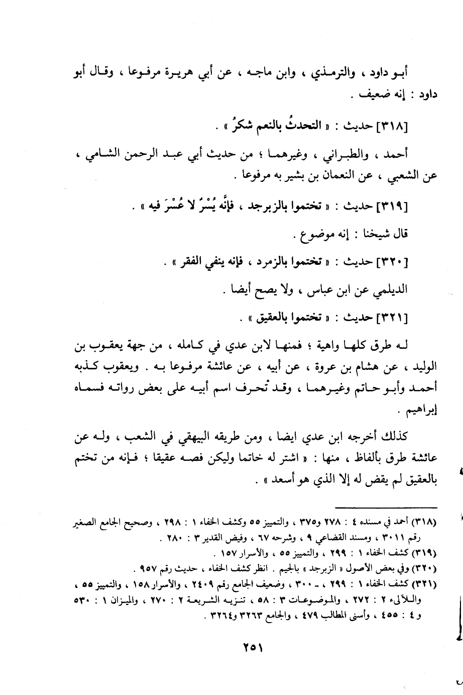 321 - حَدِيث: تَخَتَّمُوا بِالْعَقِيقِ، له طرق كلها واهية، فمنها لابن عدي في كامله من جهة يعقوب بن الوليد، عن هشام بن عروة عن أبيه عن عائشة مرفوعا به، ويعقوب كذبه أحمد وأبو حاتم وغيرهما، وقد تحرف اسم أبيه على بعض رواته فسماه إبراهيم، كذلك أخرجه ابن عدي أيضا، ومن طريقه البيهقي في الشعب، وله عن عائشة طرق بألفاظ منها: اشتر له خاتما وليكن فصه عقيقا، فإنه من تختم بالعقيق لم يقض له إلا الذي هو أسعد،