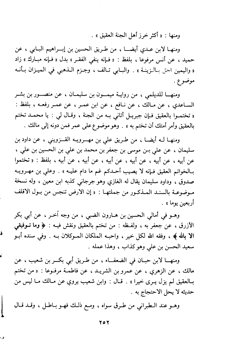 ومنها: أكثر خرز أهل الجنة العقيق، ومنها لابن عدي أيضا من طريق الحسين بن إبراهيم البابي عن حميد عن أنس مرفوعا، بلفظ: فإنه ينفي الفقر بدل فإنه مبارك، زاد: واليمين أحق بالزينة، والبابي تالف، وجزم الذهبي في الميزان بأنه موضوع، ومنها للديلمي من رواية ميمون بن سليمان عن منصور بن بشر الساعدي عن مالك عن نافع عن ابن عمر عن عمر رفعه بلفظ: تختموا بالعقيق، فإن جبريل أتاني به من الجنة، وقال لي: يا محمد تختم بالعقيق، وأمر أمتك أن تختم به، وهو موضوع على عمر فمن دونه إلى مالك، ومنها له أيضا من طريق علي بن مهرويه القزويني عن داود بن سليمان عن علي بن موسى بن جعفر بن محمد بن علي بن الحسين بن علي عن أبيه عن أبيه عن أبيه عن أبيه عن أبيه عن أبيه، بلفظ: تختوا بالخواتم العقيق، فإنه لا يصيب أحدكم غم ما دام عليه، وعلي بن مهرويه صدوق، وداود بن سليمان يقال له الغازي وهو جرجاني كذبه ابن معين، وله نسخة موضوعة بالسند المذكور من جملتها: إن الأرض تنجس من بول الأقلف أربعين يوما، وهو في أمالي الحسين بن هارون الضبي من وجه آخر عن أبي بكر الأزرق عن جعفر به، ولفظه: من تختم بالعقيق ونقش فيه {وما توفيقي إلا باللَّه} وفقه اللَّه لكل خير، وأحبه الملكان الموكلان به، وفي سنده أبو سعيد الحسن بن علي وهو كذاب، وهذا عمله، ومنها لابن حبان في الضعفاء من طريق أبي بكر بن شعيب عن مالك عن الزهري عن عمرو بن الشريد عن فاطمة مرفوعا: من تختم بالعقيق لم يزل يرى خيرا، قال: وابن شعيب يروي عن مالك ما ليس من حديثه، لا يحل الاحتجاج به، وهو عند الطبراني في معجمه الأوسط، والدارقطني في الأفراد، بل وعند الطبراني، وأبي نُعيم في الحلية، وغيرهما، من طرق سواه، ومع ذلك فهو باطل، وقد قال