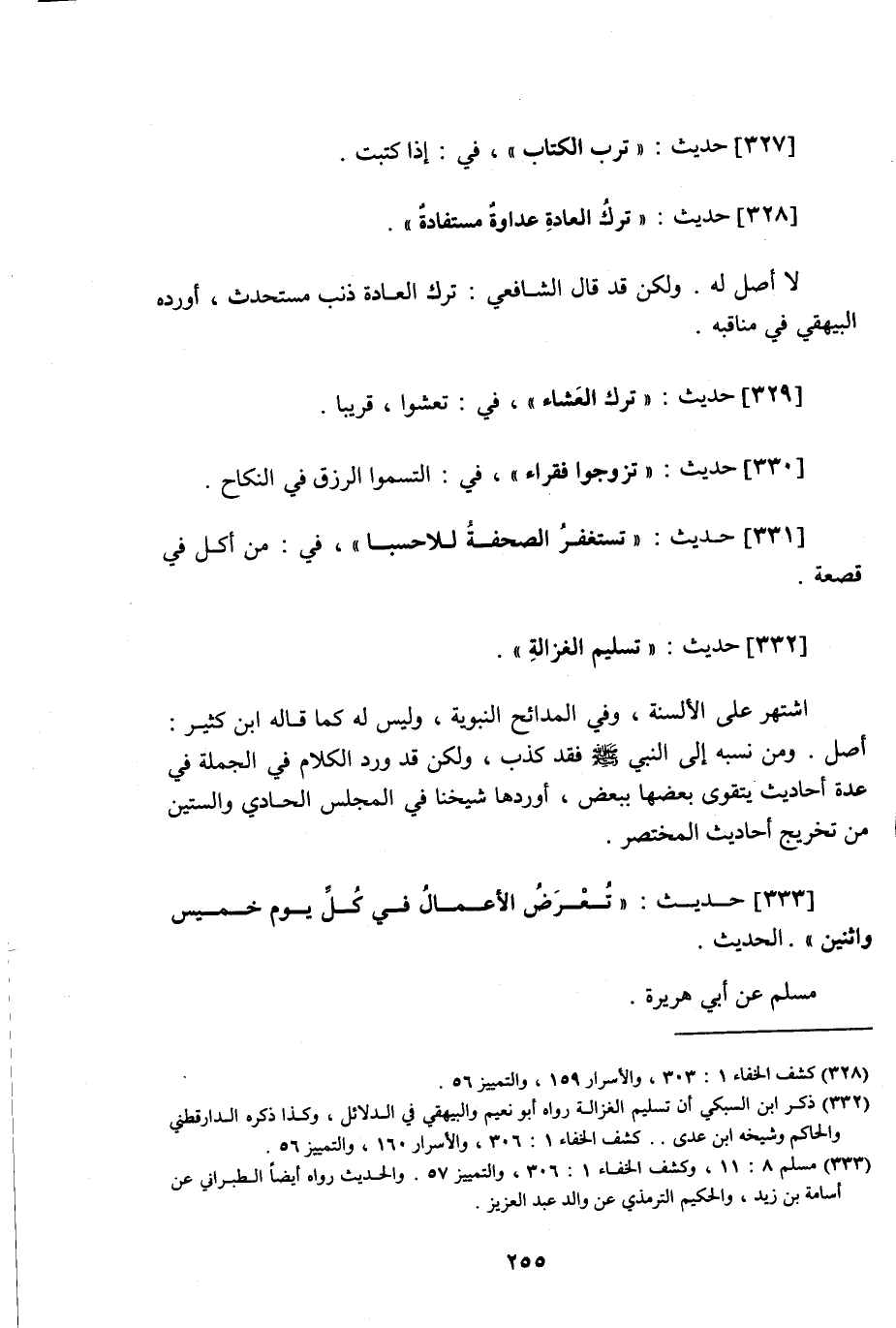 332 - حَدِيث: تَسْلِيمُ الْغَزَالَةِ، اشتهر على الألسنة، وفي المدائح النبوية، وليس له كما قاله ابن كثير أصل، ومن نسبه إلى النبي صَلَّى اللَّهُ عَلَيْهِ وَسَلَّمَ فقد كذب، ولكن قد ورد الكلام في الجملة في عدة أحاديث يتقوى بعضها ببعض، أوردها شيخنا في المجلس الحادي والستين من تخريج أحاديث المختصر.