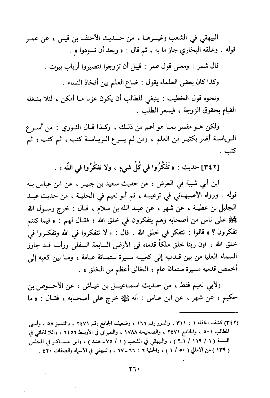 342 - حَدِيث: تَفَكَّرُوا فِي كُلِّ شَيْءٍ وَلا تَفَكَّرُوا فِي اللَّه، ابن أبي شيبة في العرش من حديث سعيد بن جبير، عن ابن عباس به قوله، ورواه الأصبهاني في ترغيبه، ثم أبو نُعيم في الحلية من حديث عبد الجليل بن عطية عن شهر عن عبد اللَّه بن سلام، قال: خرج رسول اللَّه صَلَّى اللَّهُ عَلَيْهِ وَسَلَّمَ على أناس من أصحابه، وهم يتفكرون في خلق اللَّه، فقال لهم: فيما كنتم تفكرون، قالوا: نتفكر في خلق اللَّه قال: لا تتفكروا في اللَّه وتفكروا في خلق اللَّه، فإن ربنا خلق ملكا قدماه في الأرض السابعة السفلى، ورأسه قد جاوز السماء العليا من بين قدميه إلى كعبيه مسيرة ستمائة عام، وما بين كعبه إلى أخمص قدميه مسيرة ستمائة عام، الخالق أعظم من الخلق، ولأبي نُعيم فقط من حديث إسماعيل بن عياش عن الأحوص بن حكيم عن شهر عن ابن عباس أنه صَلَّى اللَّهُ عَلَيْهِ وَسَلَّمَ خرج على أصحابه، فقال: ما