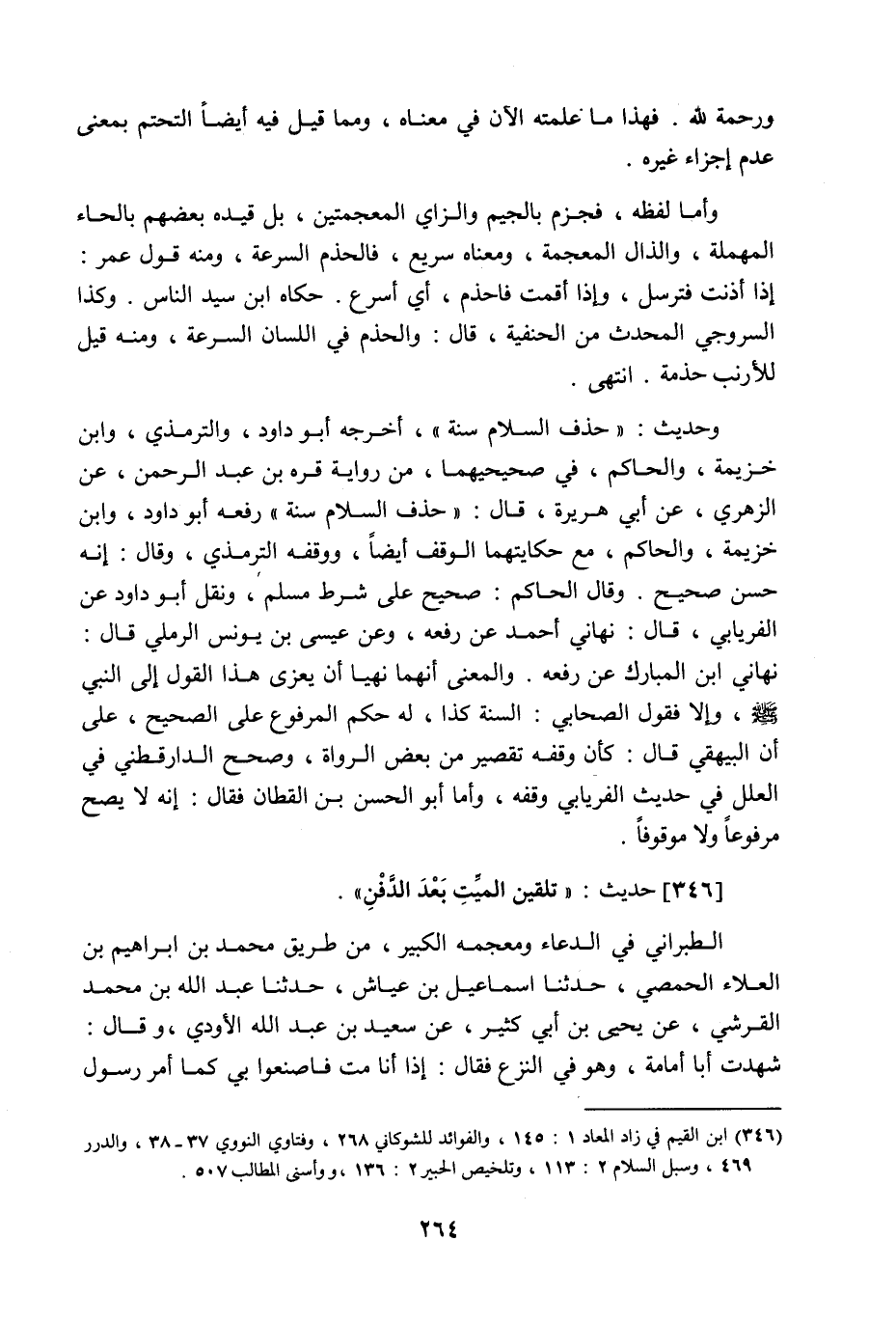 ورحمة لله، فهذا ما علمته الآن في معناه، ومما قيل فيه أيضا التحتم بمعنى عدم إجزاء غيره، وأما لفظه فجزم بالجيم والزاي المعجمتين، بل قيده بعضهم بالحاء المهملة، والذال المعجمة ومعناه سريع، فالحذم السرعة، ومنه قول عمر: إذا أذنت فترسل، وإذا أقمت فاحذم. أي أسرع، حكاه ابن سيد الناس، وكذا السروجي المحدث من الحنفية قال: والحذم في اللسان السرعة، ومنه قيل للأرنب حذمة انتهى، وحديث: حذف السلام سنة، أخرجه أبو داود والترمذي، وابن خزيمة والحاكم في صحيحهما من رواية قرة بن عبد الرحمن عن الزهري عن أبي هريرة، قال: حذف السلام سنة، رفعه أبو داود وابن خزيمة والحاكم مع حكايتهما الوقف أيضا، ووقفه الترمذي، وقال: إنه حسن صحيح، وقال الحاكم: صحيح على شرط مسلم، ونقل أبو داود عن الفريابي، قال. نهاني أحمد عن رفعه، وعن عيسى بن يونس الرملي قال: نهاني ابن المبارك عن رفعه، والمعنى أنهما نهيا أن يعزى هذا القول إلى النبي صَلَّى اللَّهُ عَلَيْهِ وَسَلَّمَ، وإلا فقول الصحابي: السنة كذا، له حكم المرفوع على الصحيح، على أن البيهقي قال: كأن وقفه تقصير من بعض الرواة، وصحح الدارقطني في العلل في حديث الفريابي وقفه، وأما أبو الحسن ابن القطان فقال: إنه لا يصح مرفوعا ولا موقوفا.