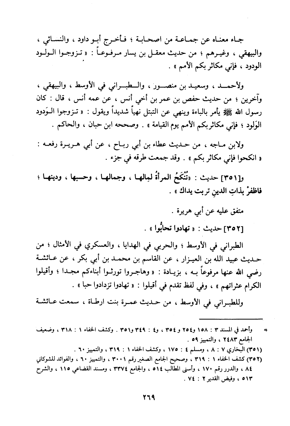 جاء معناه عن جماعة من الصحابة، فأخرج أبو داود والنسائي والبيهقي وغيرهم من حديث معقل بن يسار مرفوعا: تزوجوا الولود الودود، فإني مكاثر بكم الأمم، ولأحمد وسعيد بن منصور والطبراني في الأوسط والبيهقي وآخرين من حديث حفص بن عمر بن أخي أنس عن عمه أنس قال: كان رسول اللَّه صَلَّى اللَّهُ عَلَيْهِ وَسَلَّمَ يأمر بالباءة وينهى عن التبتل نهيا شديدا، ويقول: تزوجوا الوَدود الوَلود، فإني مكاثر بكم الأمم يوم القيامة، وصححه ابن حبان، والحاكم، ولابن ماجه من حديث عطاء بن أبي رباح، عن أبي هريرة رفعه: انكحوا فإني مكاثر بكم، وقد جمعت طرقه في جزء.
