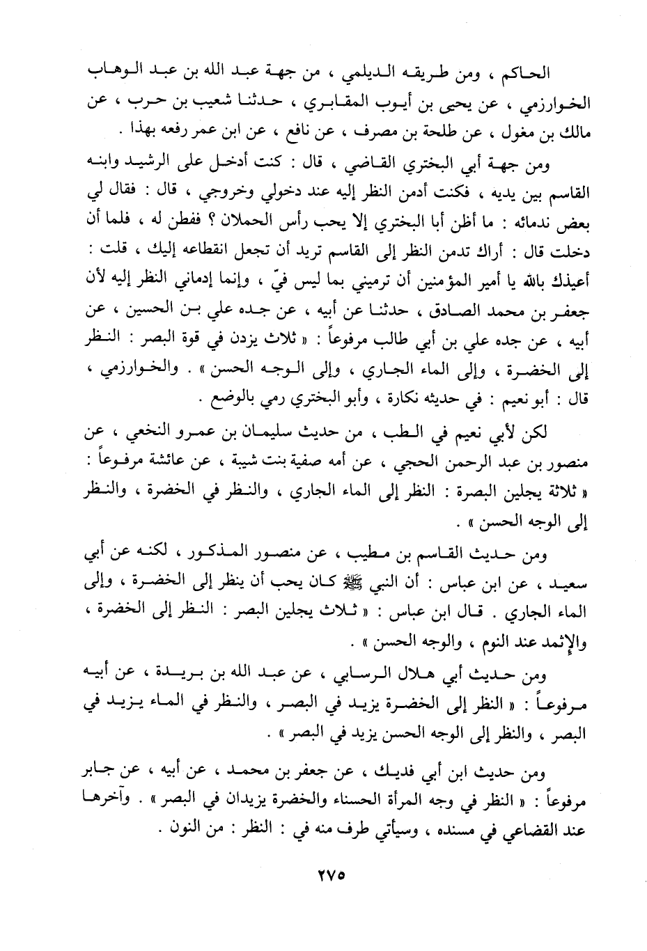 الحاكم، ومن طريقه الديلمي، من جهة عبد اللَّه بن عبد الوهاب الخوارزمي، عن يحيى بن أيوب المقابري، حدثنا شعيب بن حرب عن مالك بن مغول عن طلحة بن مصرف عن نافع عن ابن عمر رفعه بهذا، ومن جهة أبي البختري القاضي، قال: كنت أدخل على الرشيد وابنه القاسم بين يديه، فكنت أدمن النظر إليه عند دخولي وخروجي، قال: فقال لي بعض ندمائه: ما أظن أبا البختري إلا يحب رأس الحملان؟ ففطن له، فلما أن دخلت قال: أراك تدمن النظر إلى القاسم تريد أن تجعل انقطاعه إليك، قلت: أعيذك باللَّه يا أمير المؤمنين أن ترميني بما ليس فيَّ، وإنما إدماني النظر إليه لأن جعفر بن محمد الصادق، حدثنا عن أبيه عن جده علي بن الحسين، عن أبيه عن جده علي بن أبي طالب مرفوعا: ثلاث يزدن في قوة البصر: النظر إلى الخضرة، وإلى الماء الجاري، وإلى الوجه الحسن، والخوارزمي، قال أبو نُعيم: في حديثه نكارة، وأبو البختري رمي بالوضع، لكن لأبي نُعيم في الطب من حديث سليمان بن عمرو النخعي عن منصور بن عبد الرحمن الحجي عن أمه صفية ابنة شيبة، عن عائشة مرفوعا: ثلاثة يجلين البصر: النظر إلى الماء الجاري، والنظر في الخضرة، والنظر إلى الوجه الحسن، ومن حديث القاسم بن مطيب، عن منصور المذكور، لكنه عن أبي سعيد عن ابن عباس، أن النبي صَلَّى اللَّهُ عَلَيْهِ وَسَلَّمَ كان يحب أن ينظر إلى الخضرة، وإلى الماء الجاري، قال ابن عباس: ثلاث يجلين البصر: النظر إلى الخضرة، والإئمد عند النوم، والوجه الحسن، ومن حديث أبي هلال الراسبي عن عبد اللَّه بن بريدة، عن أبيه مرفوعا: النظر إلى الخضرة يزيد في البصر، والنظر في الماء يزيد في البصر، والنظر إلى الوجه الحسن يزيد في البصر، ومن حديث ابن أبي فديك عن جعفر بن محمد، عن أبيه، عن جابر مرفوعا: النظر في وجه المرأة الحسناء والخضرة يزيدان في البصر، وآخرها عند القضاعي (¬1) في مسنده، وسيأتي طرف منه في: النظر، من النون.