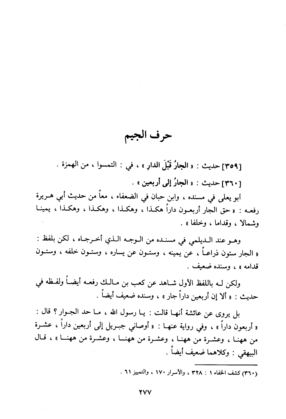 360 - حَدِيث: الْجَارُ إِلَى أَرْبَعِينَ، أبو يعلى في مسنده، وابن حبان في الضعفاء، معا من حديث أبي هريرة رفعه: حق الجار أربعون دارا، هكذا، وهكذا، وهكذا، وهكذا، يمينا وشمالا، وقداما، وخلفا، وهو عند الديلمي في مسنده من الوجه الذي أخرجاه، لكن بلفظ: الجار ستون ذراعا عن يمينه، وستون عن يساره، وستون خلفه، وستون قدامه، وسنده ضعيف، ولكن له باللفظ الأول شاهد عن كعب بن مالك رفعه أيضا، ولفظه: في حديث: ألا إن أربعين دارا جار، وسنده ضعيف أيضا، بل يروى عن عائشة أنها قالت: يا رسول اللَّه، ما حد الجوار، قال: أربعون دارا، وفي رواية عنها: أوصاني جبريل إلى أربعين دارا، عشرة من ههنا، وعشرة من ههنا، وعشرة من ههنا، وعشرة من ههنا، قال البيهقي: وكلاهما ضعيف أيضا،