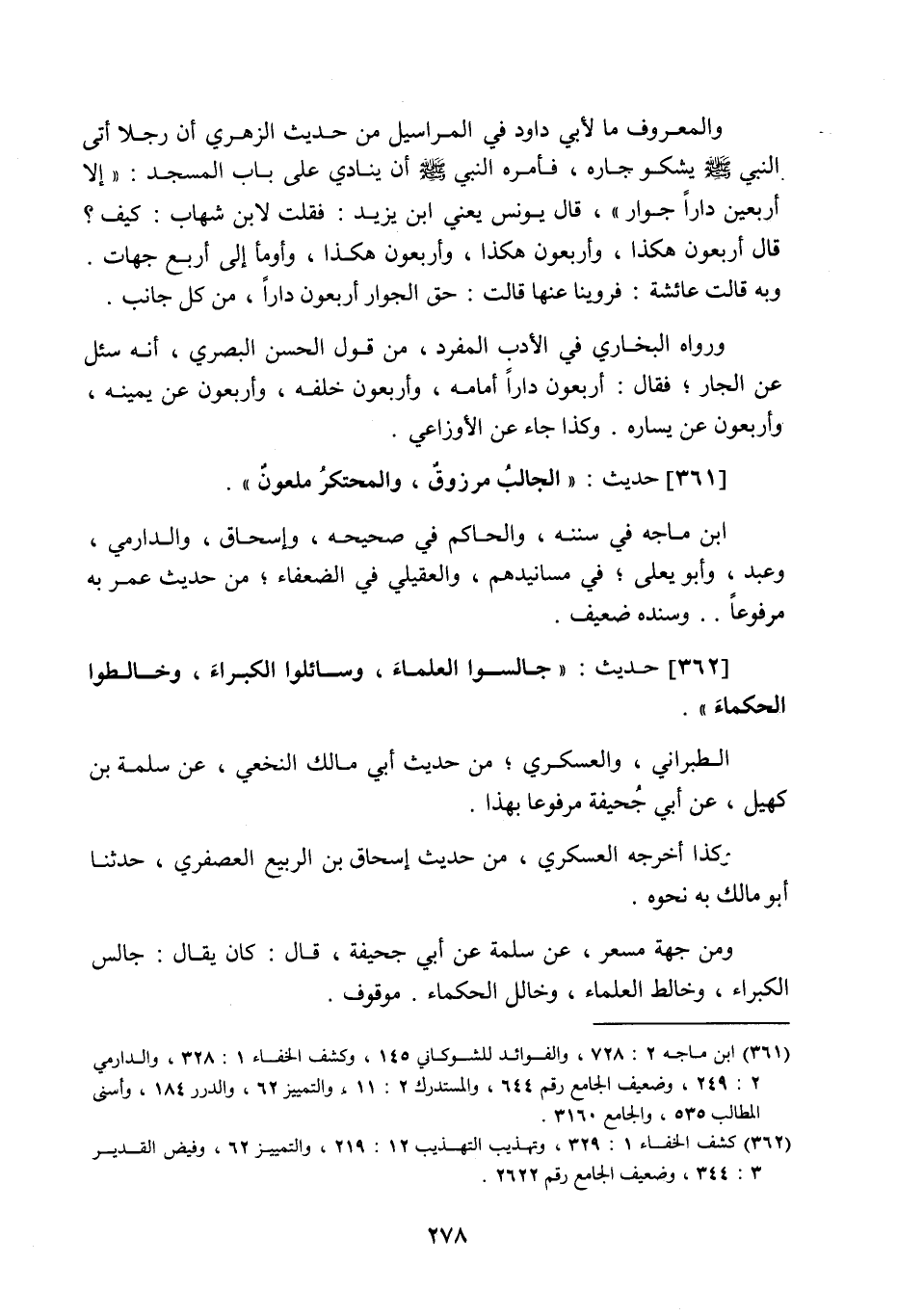 362 - حَدِيث: جَالِسُوا الْعُلَمَاءَ، وَسَائِلُوا الْكُبَرَاءَ، وَخَالِطُوا الْحُكَمَاءَ، الطبراني والعسكري من حديث أبي مالك النخعي، عن سلمة بن كهيل عن أبي جُحيفة مرفوعا بهذا، وكذا أخرجه العسكري من حديث إسحاق بن الربيع العصفري، حدثنا أبو مالك به نحوه، ومن جهة مسعر عن سلمة عن أبي جُحيفة، قال: كان يقال: جالس الكبراء، وخالط العلماء، وخالل الحكماء، موقوف،
