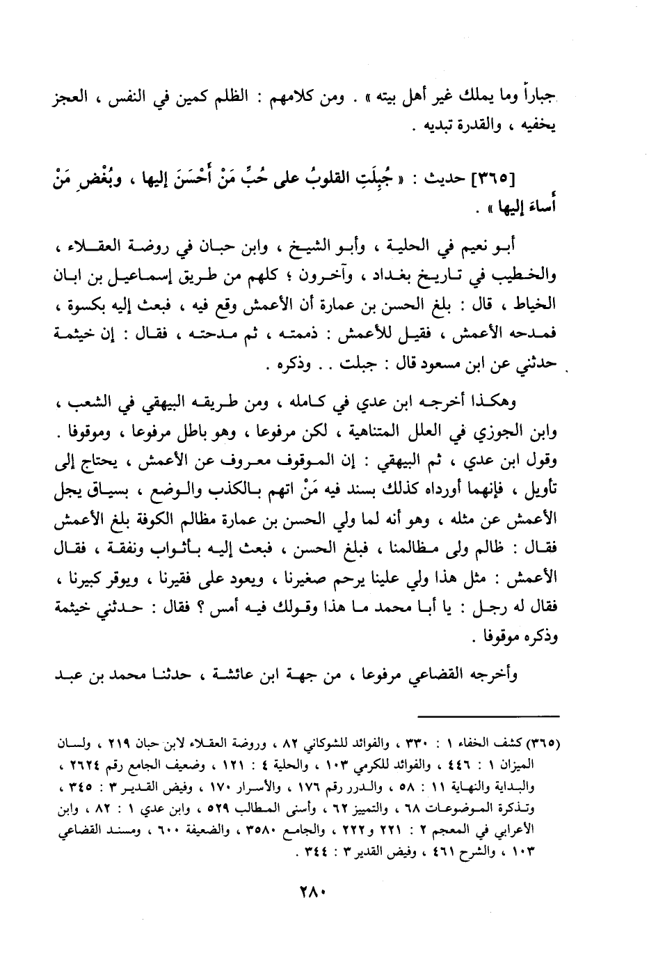 365 - حَدِيث: جُبِلَتِ الْقُلُوبُ عَلَى حُبِّ مَنْ أَحْسَنَ إِلَيْهَا، وَبُغْضِ مَنْ أَسَاءَ إِلَيْهَا، أبو نُعيم في الحلية، وأبو الشيخ، وابن حبان في روضة العقلاء، والخطيب في تاريخ بغداد، وآخرون، كلهم من طريق إسماعيل بن أبان الخياط، قال: بلغ الحسن بن عمارة أن الأعمش وقع فيه، فبعث إليه بكسوة فمدحه الأعمش، فقيل للأعمش: ذممته، ثم مدحته، فقال: إن خيثمة حدثني عن ابن مسعود قال: جبلت، وذكره، وهكذا أخرجه ابن عدي في كامله، ومن طريقه البيهقي في الشعب، وابن الجوزي في العلل المتناهية، لكن مرفوعا، وهو باطل مرفوعا، وموقوفا، وقول ابن عدي، ثم البيهقي: إن الموقوف معروف عن الأعمش، يحتاج إلى تأويل، فإنهما أورداه كذلك بسند فيه من اتهم بالكذب والوضع، بسياق يجل الأعمش عن مثله، وهو أنه لما ولى الحسن بن عمارة مظالم الكوفة بلغ الأعمش فقال: ظالم ولى مظالمنا، فبلغ الحسن، فبعث إليه بأثواب ونفقة، فقال الأعمش: مثل هذا ولي علينا يرحم صغيرنا، ويعود على فقيرنا، ويوقر كبيرنا، فقال له رجل: يا أبا محمد ما هذا وقولك فيه أمس؟ فقال: حدثني خيثمة، وذكره موقوفا، وأخرجه القضاعي مرفوعا من جهة ابن عائشة، حدثنا محمد بن عبد