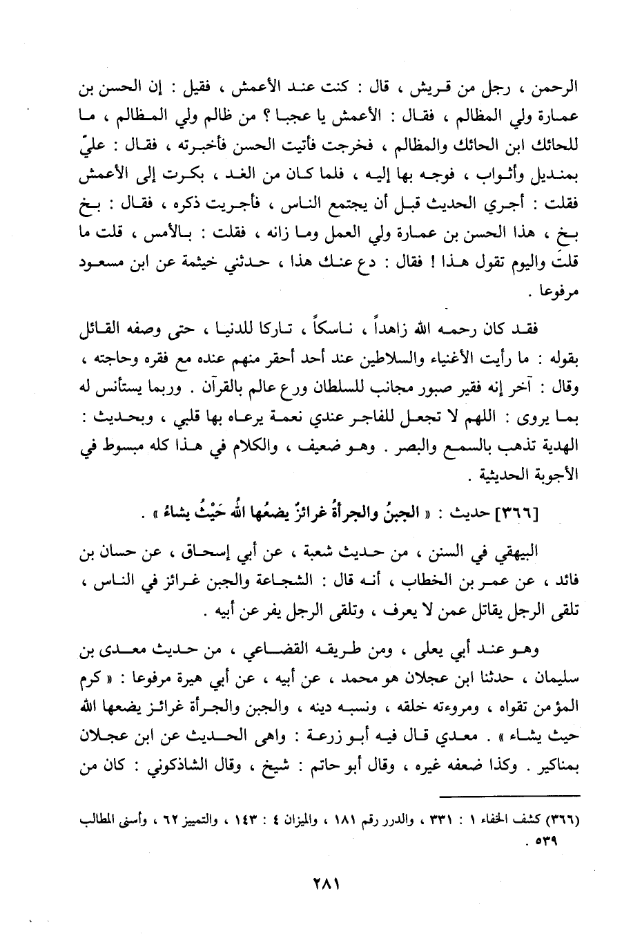 366 - حَدِيث: الْجُبْنُ وَالْجَرْأَةُ غَرَائِزُ يَضَعُهَا اللَّه حَيْثُ يَشَاءُ، البيهقي في السنن من حديث شعبة عن أبي إسحاق، عن حسان بن فائد، عن عمر بن الخطاب أنه قال: الشجاعة والجبن غرائز في الناس، تلقى الرجل يقاتل عمن لا يعرف، وتلقى الرجل يفر عن أبيه، وهو عند أبي يعلى، ومن طريقه القضاعي من حديث معدي بن سليمان، حدثنا ابن عجلان هو محمد عن أبيه، عن أبي هريرة مرفوعا: كرم المؤمن تقواه، ومروءته خلقه، ونسبه دينه، والجبن والجرأة غرائز يضعها اللَّه حيث يشاء، معدي قال فيه أبو زرعة: واهي الحديث، يحدث عن ابن عجلان بمناكير، وكذا ضعفه غيره، وقال أبو حاتم: شيخ، وقال الشاذكوني: كان من