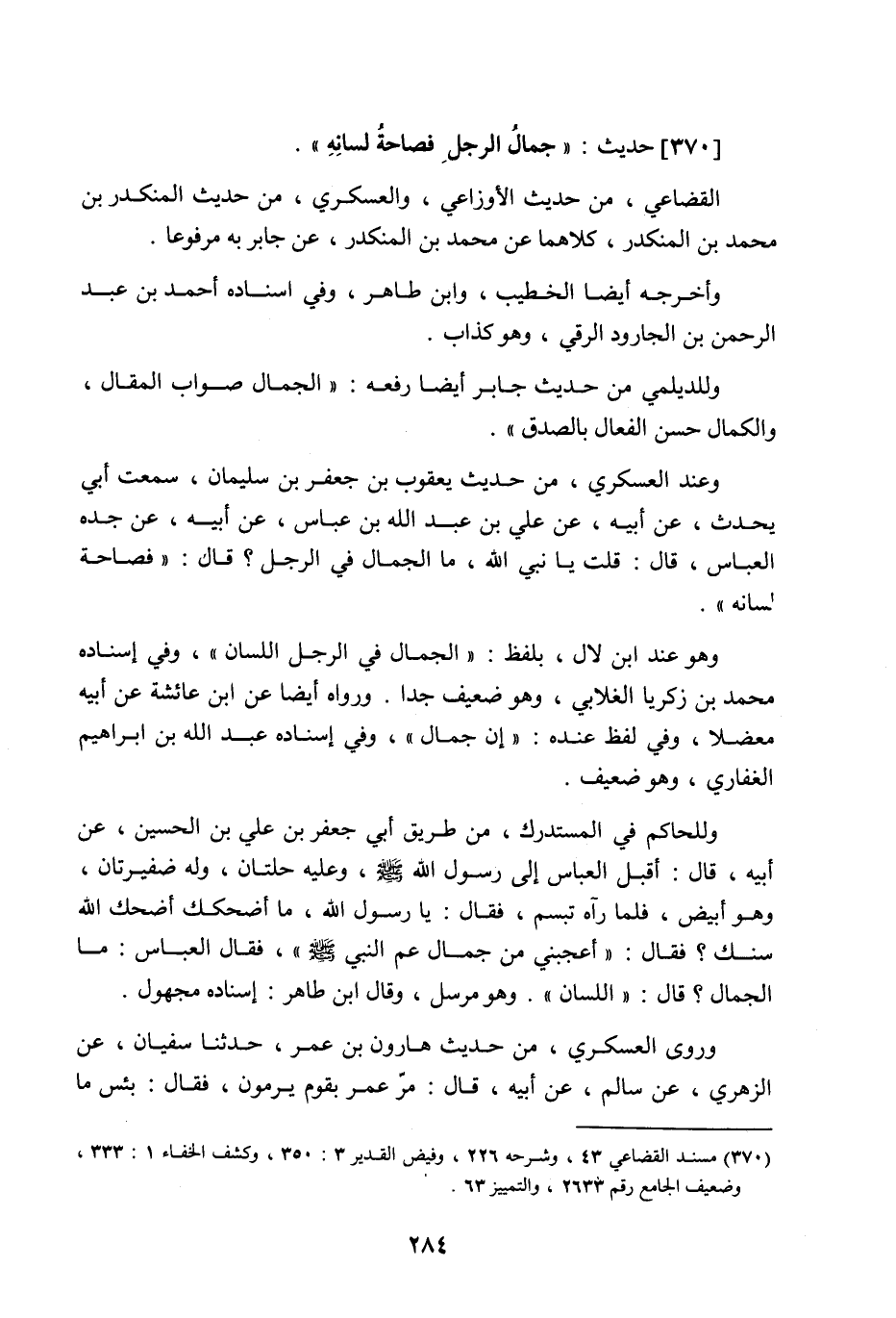 370 - حَدِيث: جَمَالُ الرَّجُلِ فَصَاحَةُ لِسَانِهِ، القضاعي من حديث الأوزاعي، والعسكري من حديث المنكدر بن محمد بن المنكدر، كلاهما عن محمد بن المنكدر، عن جابر به مرفوعا، وأخرجه أيضا الخطيب، وابن طاهر، وفي إسناده أحمد بن عبد الرحمن بن الجارود الرقي، وهو كذاب، وللديلمي من حديث جابر أيضا رفعه: الجمال صواب المقال، والكمال حسن الفعال بالصدق، وعند العسكري من حديث يعقوب بن جعفر بن سليمان سمعت أبي يحدث عن أبيه عن علي بن عبد اللَّه بن عباس عن أبيه عن جده العباس، قال: قلت يا نبي اللَّه، ما الجمال في الرجل، قال: فصاحة لسانه، وهو عند ابن لال، بلفظ: الجمال في الرجل اللسان، وفي إسناده محمد بن زكريا الغلابي، وهو ضعيف جدا، ورواه أيضا عن ابن عائشة عن أبيه معضلا، وفي لفظ عنده: إن جمال، وفي إسناده عبد اللَّه بن إبراهيم الغفاري وهو ضعيف، وللحاكم في المستدرك من طريق أبي جعفر بن علي بن الحسين عن أبيه، قال: أقبل العباس إلى رسول اللَّه صَلَّى اللَّهُ عَلَيْهِ وَسَلَّمَ وعليه حلتان، وله ضفيرتان، وهو أبيض، فلما رآه تبسم، فقال: يا رسول اللَّه، ما أضحكك أضحك اللَّه سنك؟ فقال: أعجبني من جمال عم النبي صَلَّى اللَّهُ عَلَيْهِ وَسَلَّمَ، فقال العباس: ما الجمال؟ قال: اللسان، وهو مرسل، وقال ابن طاهر: إسناده مجهول، وروى العسكري من حديث هارون بن عمر، حدثنا سفيان عن الزهري عن سالم عن أبيه، قال: مر عمر بقوم يرمون، فقال: بئس ما