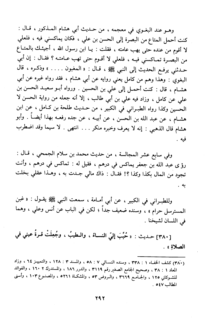 ، وهو عند البغوي في معجمه من حديث أبي هشام المذكور، قال: كنت أحمل المتاع من البصرة إلى الحسن بن علي، فكان يماكسني فيه، فلعلي لا أقوم من عنده حتى يهب عامته، فقلت: يا ابن رسول اللَّه! أجيئك بالمتاع من البصرة تماكسني فيه، فلعلي لا أقوم حتى تهب عامته؟ فقال: إن أبي حدثني يرفع الحديث إلى النبي صَلَّى اللَّهُ عَلَيْهِ وَسَلَّمَ، قال: المغبون، وذكره، قال البغوي: وهذا وهم من كامل، يعني راويه، عن أبي هشام، فقد رواه غيره عن أبي هشام، قال: كنت أحمل إلى علي بن الحسين، ورواه أبو سعيد الحسن بن علي عن كامل، وزاد فيه علي بن أبي طالب، إلا أنه جعله من رواية الحسن لا الحسين، وكذا رواه الطبراني في الكبير من حديث طلحة بن كامل عن ابن هشام عن عبد اللَّه بن الحسن عن أبيه عن جده رفعه بهذا أيضا، وأبو هشام، قال الذهبي: إنه لا يعرف، وخبره منكر انتهى، لا سيما وقد اضطرب فيه، وفي سابع عشر المجالسة من حديث محمد بن سلام الجمحي، قال: رؤي عبد اللَّه بن جعفر يماكس في درهم فقيل له: تماكس في درهم، وأنت تجود من المال بكذا وكذا، فقال: ذاك مالي جدت به، وهذا عقلي بخلت به، وللطبراني في الكبير عن أبي أمامة سمعت النبي صَلَّى اللَّهُ عَلَيْهِ وَسَلَّمَ يقول: غبن المسترسل حرام، وسنده ضعيف جدً، لكن في الباب عن أنس وعلي وهما في اللسان لشيخنا.