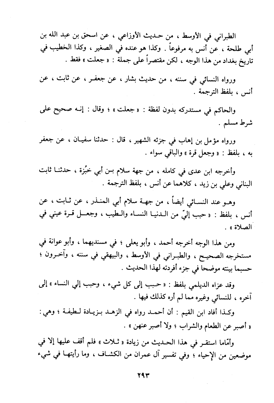 الطبراني في الأوسط، من حديث الأوزاعي عن إسحاق بن عبد اللَّه بن أبي طلحة، عن أنس به مرفوعا، وكذا هو عنده في الصغير، وكذا الخطيب في تاريخ بغداد من هذا الوجه، لكن مقتصرا على جملة: جعلت فقط، ورواه النسائي في سننه من حديث بشَّارعن جعفر عن ثابت عن أنس بلفظ الترجمة، والحاكم في مستدركه بدون لفظة: جعلت، وقال: إنه صحيح على شرط مسلم، ورواه مؤمل بن إهاب في جزئه الشهير، قال: حدثنا سفيان عن جعفر به بلفظ: وجعل قرة، والباقي سواء، وأخرجه ابن عدي في كامله من جهة سلام ابن أبي خُبزة، حدثنا ثابت البناني وعلي بن زيد، كلاهما عن أنس بلفظ الترجمة، وهو عند النسائي أيضاً من جهة سلام أبي المنذر عن ثابت عن أنس بلفظ: حبب إلي من الدنيا النساء، والطيب، وجعل قرة عيني في الصلاة، ومن هذا الوجه أخرجه أحمد وأبو يعلى في مسنديهما، وأبو عوانة في مستخرجه الصحيح، والطبراني في الأوسط، والبيهقي في سننه، وآخرون، حسبما بينته موضحا في جزء أفردته لهذا الحديث، وقد عزاه الديلمي بلفظ: حبب إلي كل شيء. وحبب إلي النساء، إلى آخره للنسائي وغيره مما لم أره كذلك فيها، وكذا أفاد ابن القيم أن أحمد رواه في الزهد بزيادة لطيفة، وهي: أصبر عن الطعام والشراب، ولا أصبر عنهن، وأما ما استقر في هذا الحديث من زيادة ثلاث، فلم أقف عليها إلا في موضعين من الإحياء؛ وفي تفسير آل عمران، من الكشاف، وما رأيتها في شيء
