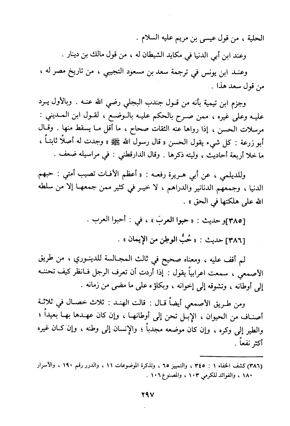 386 - حَدِيث: حُبُّ الْوَطَنِ مِنَ الإِيمَانِ، لم أقف عليه، ومعناه صحيح في ثالث المجالسة للدينوري من طريق الأصمعي، سمعت أعرابيا يقول: إذا أردت أن تعرف الرجل فانظر كيف تحننه إلى أوطانه، وتشوقه إلى إخوانه، وبكاؤه على ما مضى من زمانه، ومن طريق الأصمعي أيضا، قال: قالت الهند: ثلاث خصال في ثلاثة أصناف من الحيوان، الإبل تحن إلى أوطانها، وإن كان عهدها بها بعيدا، والطير إلى وكره، وإن كان موضعه مجدبا، والإنسان إلى وطنه، وإن كان غيره أكثر نفعا،