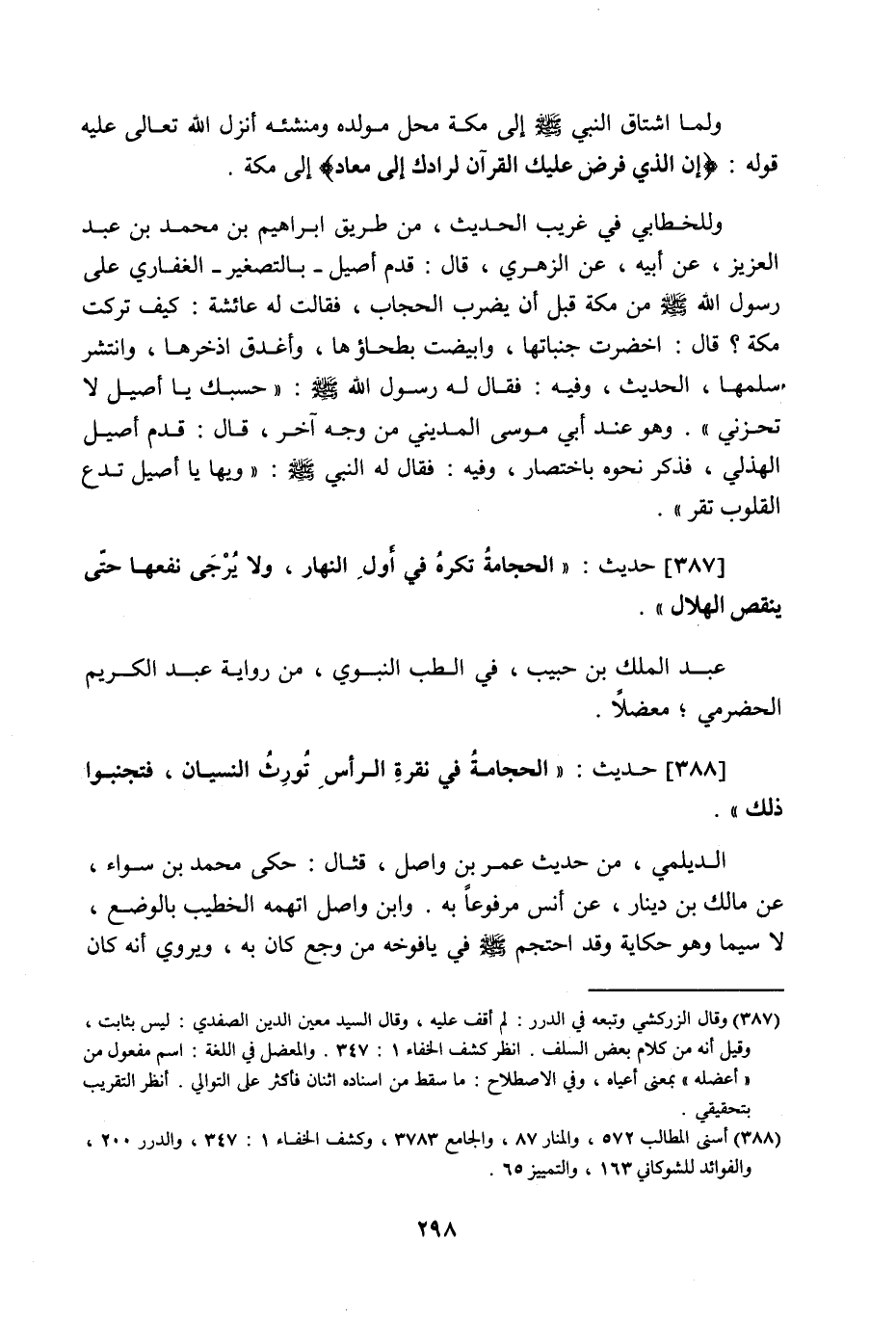 387 - حَدِيث: الْحِجَامَةُ تُكْرَهُ فِي أَوَّلِ النَّهَارِ، وَلا يُرْجَى نَفْعُهَا حَتَّى يَنْقُصَ الْهِلالُ، عبد الملك بن حبيب في الطب النبوي من رواية عبد الكريم الحضرمي معضلا.