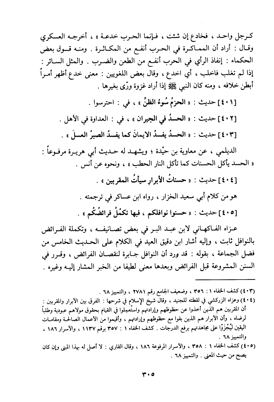 405 - حَدِيث: حَسِّنُوا نَوَافِلَكُمْ، فَبِهَا تَكْمُلُ فَرَائِضُكُمْ، عزاه الفاكهاني لابن عبد البر في بعض تصانيفه، وتكملة الفرائض بالنوافل ثابت، وإليه أشار ابن دقيق العيد في الكلام على الحديث الخامس من فضل الجماعة بقوله: قد ورد أن النوافل جابرة لنقصان الفرائض، وقرر في السنن المشروعة قبل الفرائض وبعدها معنى لطيفا من الخبر المشار إليه وغيره،