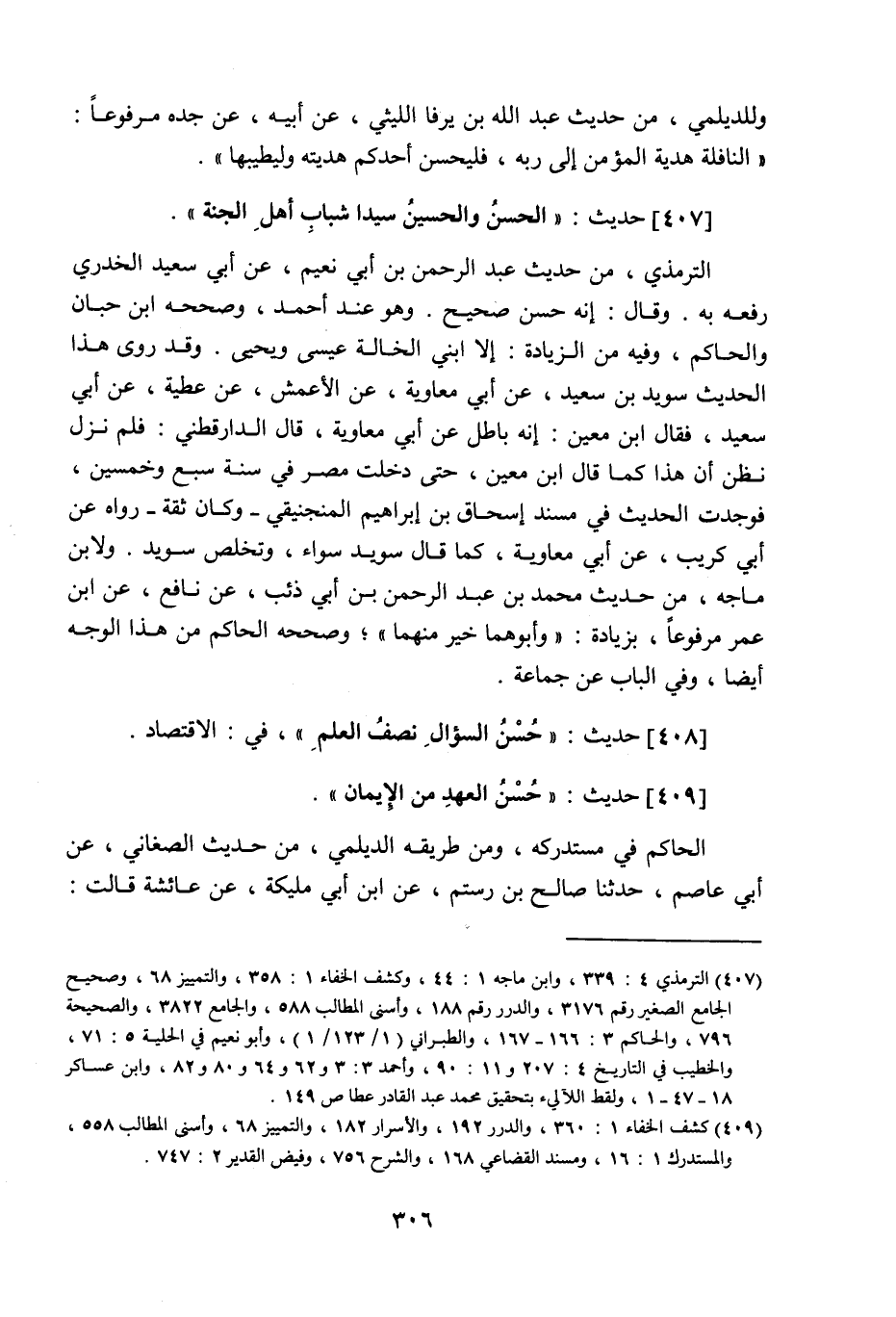 407 - حَدِيث: الْحَسَنُ وَالْحُسَيْنُ سَيِّدَا شَبَابِ أَهْلِ الْجَنَّةِ، الترمذي من حديث عبد الرحمن بن أبي نعيم عن أبي سعيد الخدري رفعه به، وقال: إنه حسن صحيح، وهو عند أحمد، وصححه ابن حبان والحاكم، وفيه من الزيادة: إلا ابني الخالة عيسى ويحيى، وقد روى هذا الحديث سويد بن سعيد عن أبي معاوية عن الأعمش عن عطية عن أبي سعيد، فقال ابن معين: إنه باطل عن أبي معاوية، قال الدارقطني: فلم نزل نظن أن هذا كما قال ابن معين حتى دخلت مصر في سنة سبع وخمسين فوجدت الحديث في مسند إسحاق بن إبراهيم المنجنيقي - وكان ثقة - رواه عن أبي كريب عن أبي معاوية كما قال سويد سواء، وتخلص سويد، ولابن ماجه من حديث محمد بن عبد الرحمن ابن أبي ذئب عن نافع عن ابن عمر مرفوعا بزيادة: وأبوهما خير منهما، وصححه الحاكم من هذا الوجه أيضا، وفي الباب عن جماعة.