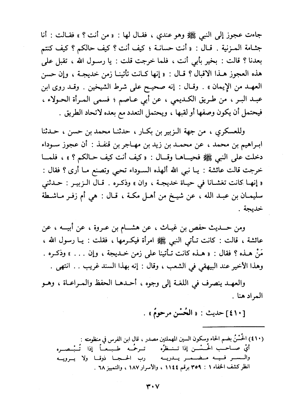 جَاءَتْ عَجُوزٌ إِلَى النَّبِيِّ صَلَّى اللَّهُ عَلَيْهِ وَسَلَّمَ وَهُوَ عِنْدِي فَقَالَ لَهَا مَنْ أَنْتِ فَقَالَتْ: أَنَا جَثَّامَةُ الْمُزَنِيَّةُ قَالَ أَنْتِ حَسَّانَةُ؛ كَيْفَ أَنْتِ كَيْفَ حَالُكُمْ كَيْفَ كُنْتُمْ بَعْدَنَا، قَالَتْ بِخَيْرٍ بِأَبِي أَنْتَ، فَلَمَّا خَرَجَتْ قُلْتُ يَا رَسُولَ اللَّهِ: تُقْبِلُ عَلَى هَذِهِ الْعَجُوزِ هَذَا الإِقْبَالَ؟ قَالَ: إِنَّهَا كَانَتْ تَأْتِينَا زَمَنَ خَدِيجَةَ وَإِنَّ حُسْنَ الْعَهْدِ مِنَ الإِيمَانِ وقال: إنه صحيح على شرط الشيخين، وقد روى ابن عبد البر من طريق الكديمي عن أبي عاصم فسمى المرأة الحولاء، فيحتمل أن يكون وصفها أو لقبها، ويحتمل التعدد مع بعده لاتحاد الطريق، وللعسكري من جهة الزبير بن بكار، حدثنا محمد بن حسن، حدثنا إبراهيم بن محمد عن محمد بن زيد بن مهاجر بن قنفذ أن عجوزا سوداء دخلت على النبي صَلَّى اللَّهُ عَلَيْهِ وَسَلَّمَ فحياها وقال: كيف أنت كيف حالكم، فلما خرجت قالت عائشة: يا نبي الله ألهذه السواء تحيي وتصنع ما أرى؟ فقال: إنها كانت تغشانا في حياة خديجة، وإن، وذكره قال الزبير حدثني سليمان بن عبد اللَّه عن شيخ من أهل مكة قال: هي أم زفر ماشطة خديجة، ومن حديث حفص بن غياث عن هشام بن عروة عن أبيه عن عائشة قالت: كانت تأتي النبي صَلَّى اللَّهُ عَلَيْهِ وَسَلَّمَ امرأة فيكرمها فقلت يا رسول اللَّه من هذه؟ فقال: هذه كانت تأتينا على زمن خديجة، وإن وذكره، وهذا الأخير عند البيهقي في الشعب، وقال: إنه بهذا السند غريب. انتهى، والعهد ينصرف في اللغة إلى وجوه أحدها الحفظ والمراعاة وهو المراد هنا.