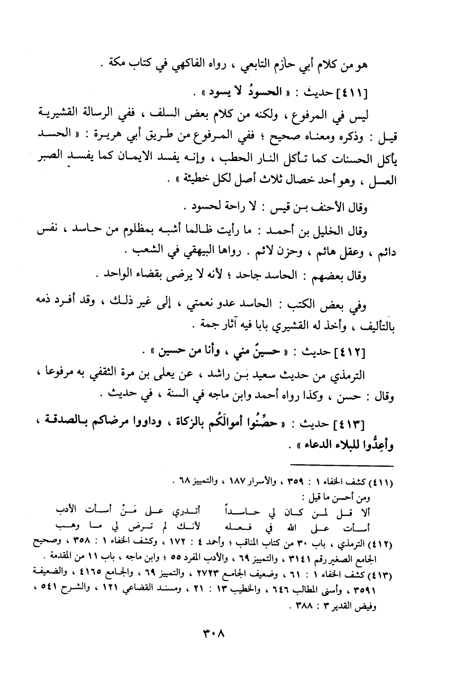 411 - حديث: الحسود لا يسود، ليس في المرفوع، ولكنه من كلام بعض السلف، ففي الرسالة القشيرية قيل: وذكره. ومعناه صحيح، ففي المرفوع من طريق أبي هريرة: الحسد يأكل الحسنات كما تأكل النار الحطب، وإنه يفسد الإيمان كما يفسد الصبر العسل، وهو أحد خصال ثلاث أصل لكل خطيئة وقال الأحنف ابن قيس: لا راحة لحسود، وقال الخليل بن أحمد: ما رأيت ظالما أشبه بمظلوم من حاسد، نفس دائم، وعقل هائم، وحزن لائم، رواها البيهقي في الشعب، وقال بعضهم: الحاسد جاحد، لأنه لا يرضى بقضاء الواحد، وفي بعض الكتب: الحاسد عدو نعمتي إلى غير ذلك، وقد أفرد ذمه بالتأليف، وأخذ له القشيري بابا فيه آثار جمة.