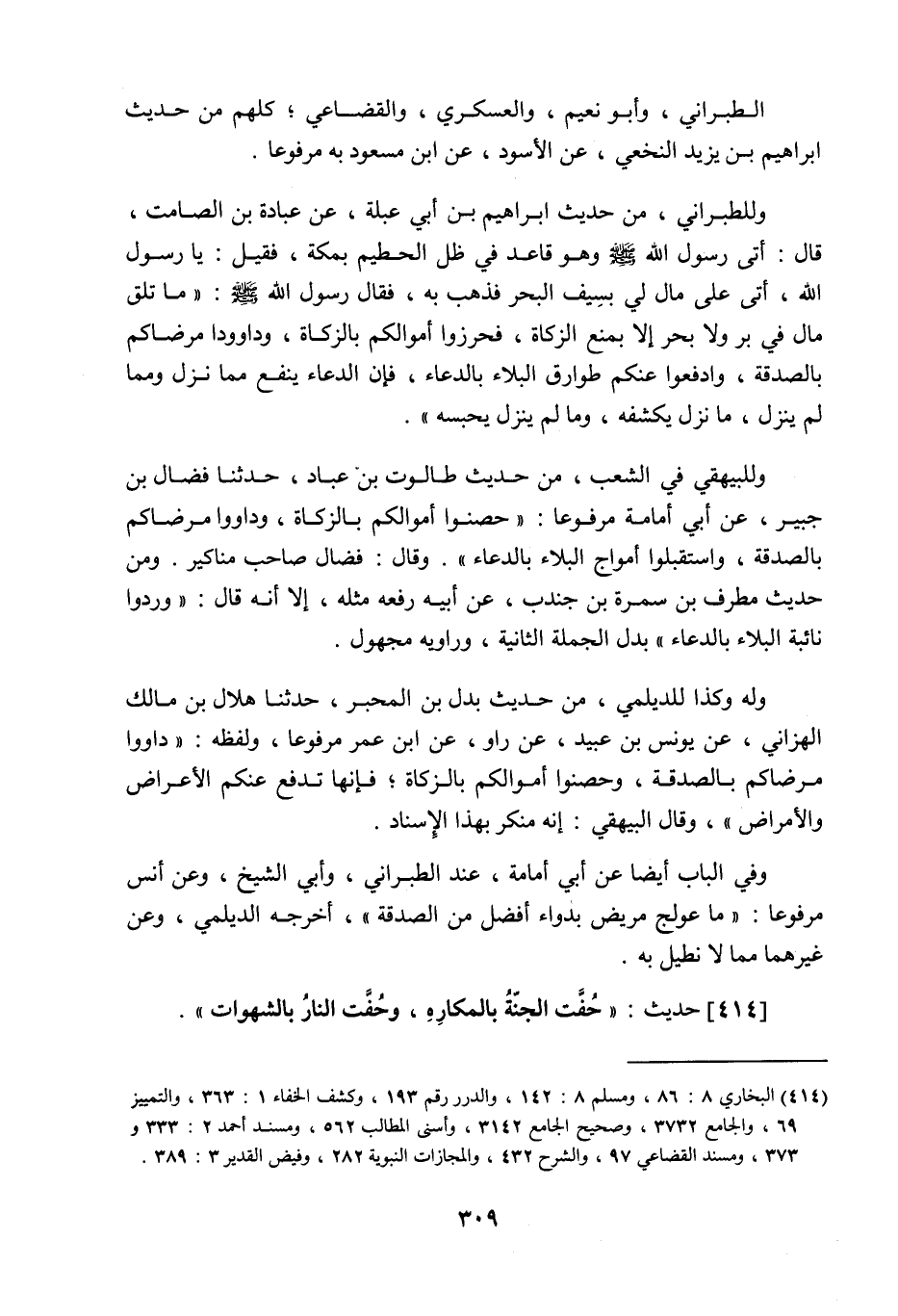 الطبراني وأبو نُعيم والعسكري والقضاعي، كلهم من حديث إبراهيم بن يزيد النخعي عن الأسود عن ابن مسعود به مرفوعا، وللطبراني من حديث إبراهيم ابن أبي عبلة عن عبادة بن الصامت قال: أتى رسول اللَّه صَلَّى اللَّهُ عَلَيْهِ وَسَلَّمَ وهو قاعد في ظل الحطيم بمكة فقيل: يا رسول اللَّه أتى على مال لي بسيف البحر فذهب به، فقال رسول اللَّه صَلَّى اللَّهُ عَلَيْهِ وَسَلَّمَ: ما تلف مال في بر ولا بحر إلا بمنع الزكاة، فحرزوا أموالكم بالزكاة، وداووا مرضاكم بالصدقة، وادفعوا عنكم طوارق البلاء بالدعاء، فإن الدعاء ينفع مما نزل ومما لم ينزل، ما نزل يكشفه، وما لم ينزل يحبسه، وللبيهقي في الشعب من حديث طالوت ابن عباد، حدثنا فضال بن جبير عن أبي أمامة مرفوعا: حصنوا أموالكم بالزكاة، وداووا مرضاكم بالصدقة، واستقبلوا أمواج البلاء بالدعاء، وقال: فضال صاحب مناكير، ومن حديث مطرف بن سمرة بن جندب عن أبيه رفعه مثله، إلا أنه قال: وردوا نائبة البلاء بالدعاء، بدل الجملة الثانية وراويه مجهول، وله وكذا للديلمي من حديث بدل بن المحبر، حدثنا هلال بن مالك الهزاني عن يونس بن عبيد عن راو عن ابن عمر مرفوعا ولفظه: داووا مرضاكم بالصدقة، وحصنوا أموالكم بالزكاة، فإنها تدفع عنكم الأعراض والأمراض. وقال البيهقي: إنه منكر بهذا الإسناد. وفي الباب أيضا عن أبي أمامة عند الطبراني وأبي الشيخ، وعن أنس مرفوعا: ما عولج مريض بدواء أفضل من الصدقة، أخرجه الديلمي وعن غيرهما مما لا نطيل به.