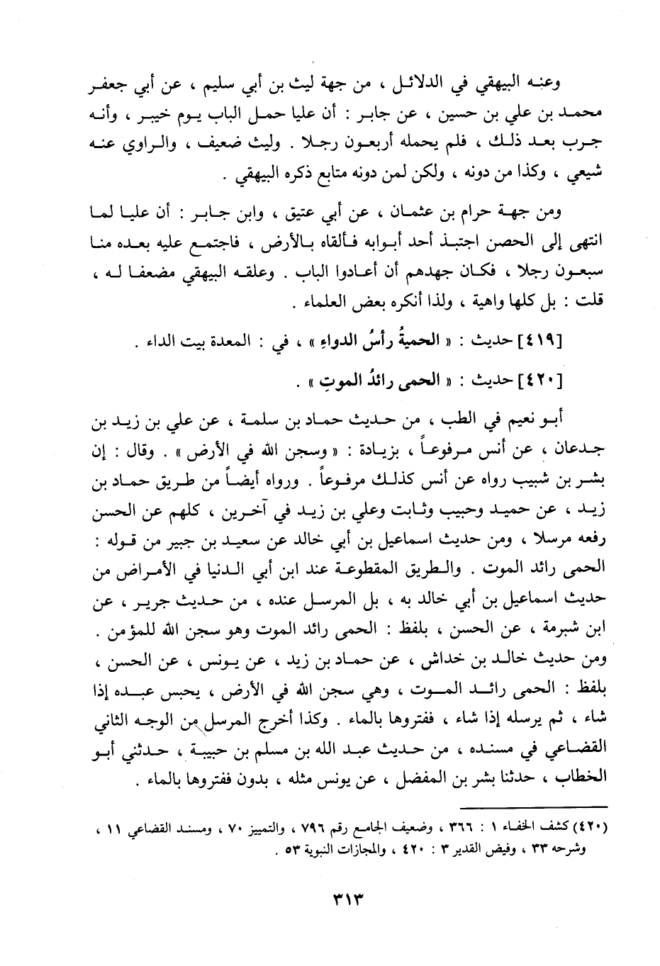 420 - حَدِيث: الْحُمَّى رَائِدُ الْمَوْتِ، أبو نُعيم في الطب من حديث حماد بن سلمة عن علي بن زيد بن جدعان عن أنس مرفوعا بزيادة: وسجن اللَّه في الأرض، وقال: إن بشر بن شبيب رواه عن أنس مرفوعا، ورواه أيضا من طريق حماد بن زيد عن حميد وحبيب وثابت وعلي بن زيد في آخرين، كلهم عن الحسن رفعه مرسلا، ومن حديث إسماعيل بن أبي خالد عن سعيد بن جبير من قوله: الحمى رائد الموت، والطريق المقطوعة عند ابن أبي الدنيا في الأمراض من حديث إسماعيل ابن أبي خالد به، بل المرسل عنده من حديث جرير عن ابن شبرمة عن الحسن بلفظ: الحمى رائد الموت وهو سجن اللَّه للمؤمن، ومن حديث خالد بن خداش عن حماد بن زيد، عن يونس، عن الحسن بلفظ: الحمى رائد الموت، وهي سجن اللَّه في الأرض يحبس عبده إذا شاء، ثم يرسله إذا شاء، ففتروها بالماء، وكذا أخرج المرسل من الوجه الثاني القضاعي في مسنده من حديث عبد اللَّه بن مسلم بن حبيبة حدثني أبو الخطاب حدثنا بشر بن المفضل عن يونس مثله، بدون ففتروها بالماء،