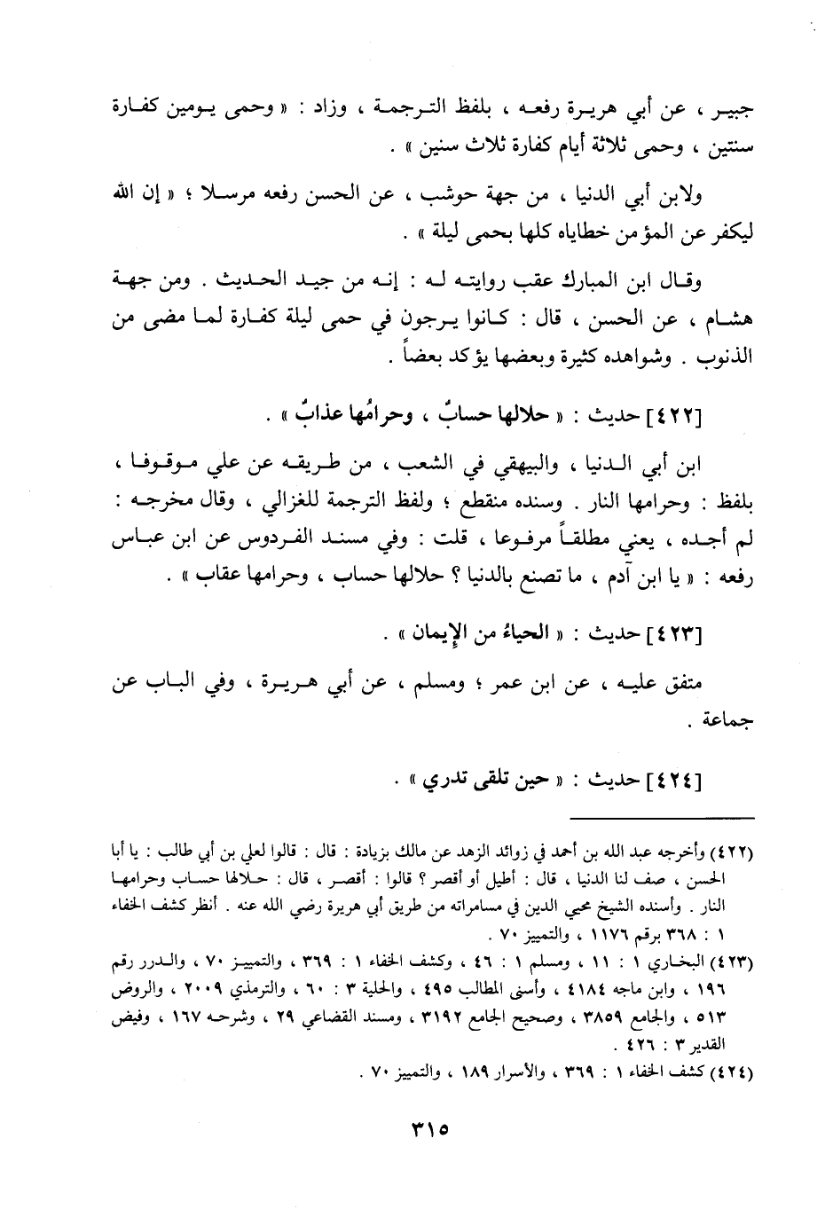 422 - حَدِيث: حَلالُهَا حِسَابٌ، وَحَرَامُهَا عَذَابٌ، ابن أبي الدنيا والبيهقي في الشعب من طريقه عن علي موقوفا بلفظ: وحرامها النار وسنده منقطع، ولفظ الترجمة للغزالي، وقال مخرجه: لم أجده يعني مطلقا مرفوعا، قلت: وفي مسند الفردوس عن ابن عباس رفعه: يا ابن آدم ما تصنع بالدنيا؟ حلالها حساب، وحرامها عقاب.