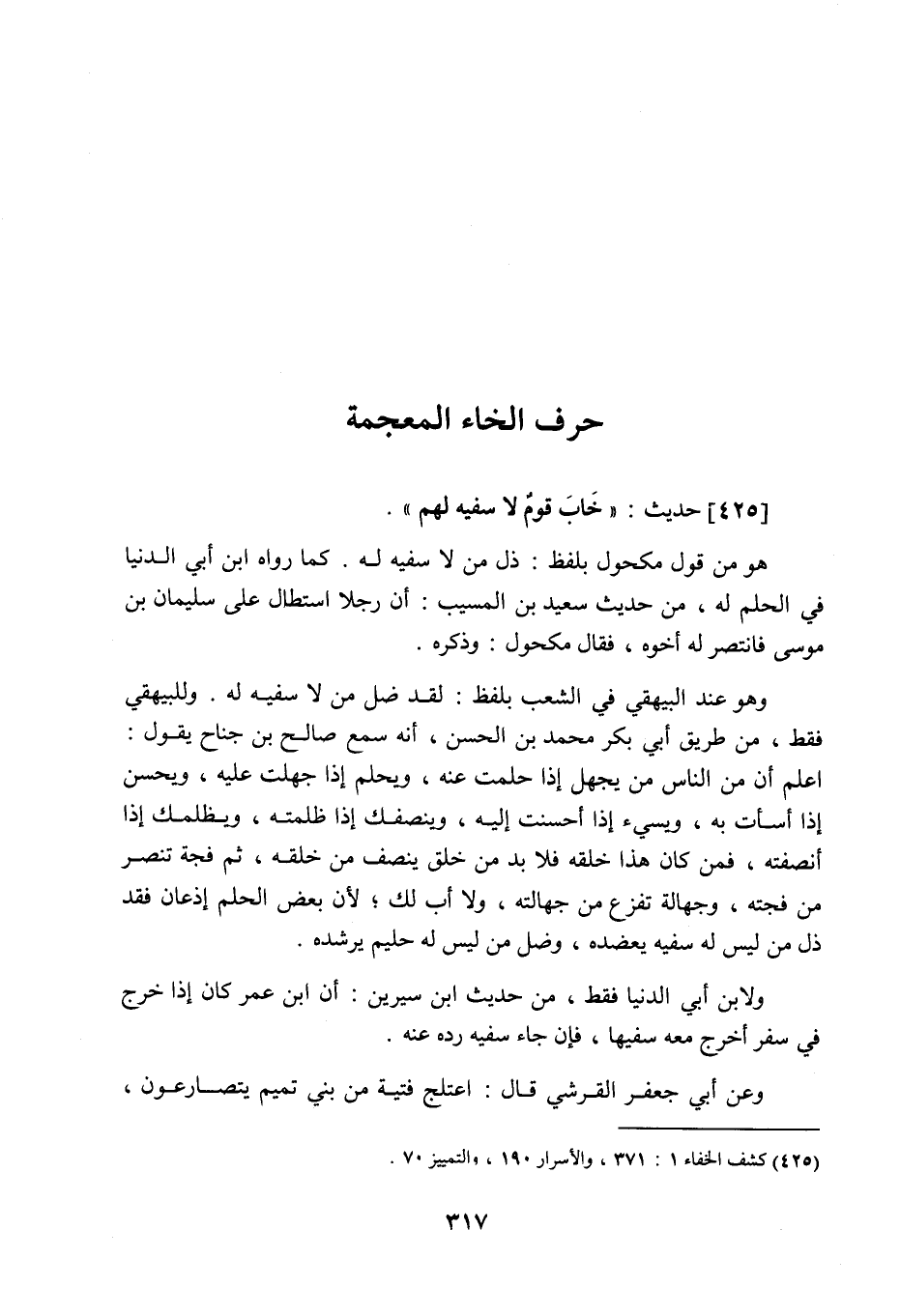 425 - حَدِيث: خَابَ قَوْمٌ لا سَفِيهَ لَهُمْ، هو من قول مكحول بلفظ: ذل من لا سفيه له، كما رواه ابن أبي الدنيا في الحلم له من حديث سعيد بن المسيب، أن رجلا استطال على سليمان بن موسى فانتصر له أخوه، فقال مكحول: وذكره، وهو عند البيهقي في الشعب بلفظ: لقد ضل من لا سفيه له، وللبيهقي فقط من طريق أبي بكر محمد بن الحسن، أنه سمع صالح بن جناح يقول. اعلم أن من الناس من يجهل إذا حلمت عنه، ويحلم إذا جهلت عليه، ويحسن إذا أسأت به، ويسيء إذا أحسنت إليه، وينصفك إذا ظلمته، ويظلمك إذا أنصفته، فمن كان هذا خلقه فلا بد من خلق ينصف من خلقه، ثم فجة تنصر من فجته، وجهالة تفزع من جهالته، ولا أب لك، لأن بعض الحلم إذعان فقد ذل من ليس له سفيه يعضده، وضل من ليس له حليم يرشده، ولابن أبي الدنيا فقط من حديث ابن سيرين أن ابن عمر كان إذا خرج في سفر أخرج معه سفيها، فإن جاء سفيه رده عنه، وعن أبي جعفر القرشي قال: اعتلج فتية من بني تميم يتصارعون،