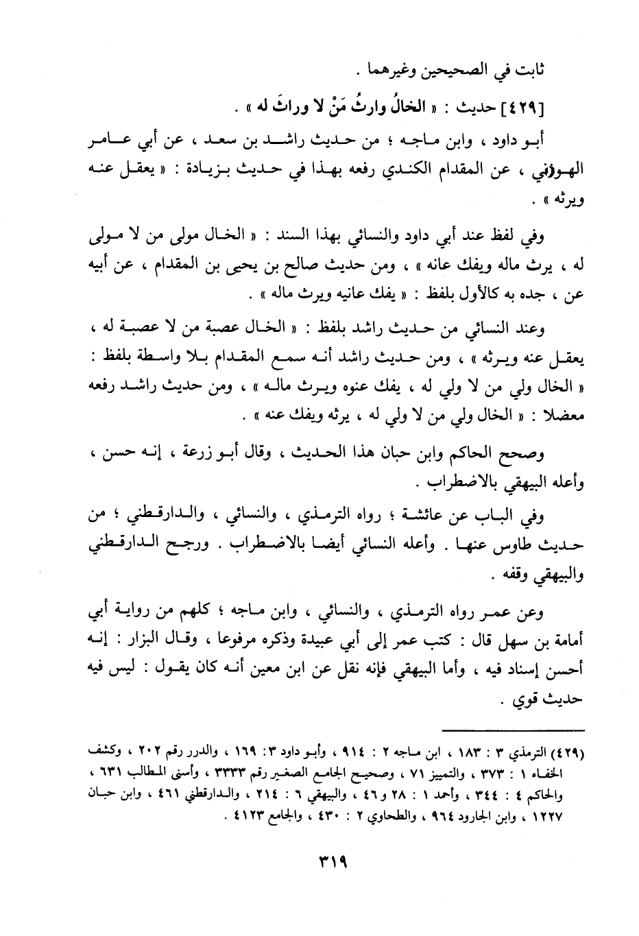 429 - حَدِيث: الْخَالُ وَارِثُ مَنْ لا وَارِثَ لَهُ، أبو داود وابن ماجه من حديث راشد بن سعد، عن أبي عامر الهوزني عن المقدام الكندي رفعه بهذا في حديث بزيادة: يعقل عنه ويرثه، وفي لفظ عند أبي داود والنسائي بهذا السند: الخال مولى من لا مولى له، يرث ماله ويفك عانه، ومن حديث صالح بن يحيى بن المقدام عن أبيه عن جده به كالأول بلفظ: يفك عانيه ويرث ماله، وعند النسائي من حديث راشد بلفظ: الخال عصبة من لا عصبة له يعقل عنه ويرثه، ومن حديث راشد أنه سمع المقدام بلا واسطة بلفظ: الخال ولي من لا ولي له يفك عنوه ويرث ماله. ومن حديث راشد رفعه معضلا: الخال ولي من لا ولي له، يرثه ويفك عنه. وصحح الحاكم وابن حبان هذا الحديث، وقال أبو زرعة: إنه حسن، وأعله البيهقي بالاضطراب، وفي الباب عن عائشة رواه الترمذي والنسائي والدارقطني من حديث طاوس عنها، وأعله النسائي أيضا بالاضطراب، ورجح الدارقطني والبيهقي وقفه، وعن عمر رواه الترمذي والنسائي، وابن ماجه، كلهم من رواية أبي أمامة بن سهل قال: كتب عمر إلى أبي عبيدة وذكره مرفوعا، وقال البزار: إنه أحسن إسناد فيه، وأما البيهقي فإنه نقل عن ابن معين أنه كان يقول: ليس فيه حديث قوي،