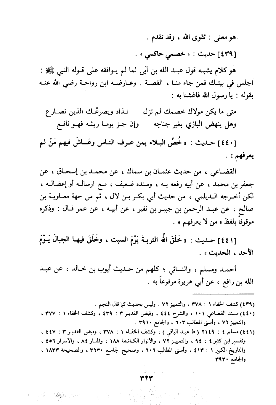 439 - حَدِيث: خَصْمِي حَاكِمِي، هو كلام يشبه قول عبد اللَّه بن أبيّ لما لم يوافقه على قوله النبي صَلَّى اللَّهُ عَلَيْهِ وَسَلَّمَ: اجلس في بيتك فمن جاء منا، القصة. وعارضه ابن رواحة رضي اللَّه عنه بقوله: يا رسول اللَّه فاغشنا به.