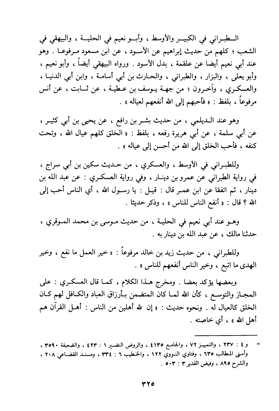 الطبراني في الكبير والأوسط، وأبو نُعيم في الحلية، والبيهقي في الشعب، كلهم من حديث إبراهيم عن الأسود، عن ابن عباس مرفوعا، وهو عند أبي نُعيم أيضا عن علقمة، بدل الأسود، ورواه البيهقي أيضا، وأبو نعيم، وأبو يعلى، والبزار، والطبراني، والحارث ابن أبي أسامة، وابن أبي الدنيا، والعسكري، وآخرون، من جهة يوسف بن عطية، عن ثابت عن أنس مرفوعا بلفظ: فأحبهم إلى اللَّه أنفعهم إلى عياله، وهو عند الديلمي من حديث بشر بن رافع عن يحيى بن أبي كثير عن أبي سلمة عن أبي هريرة رفعه بلفظ: الخلق كلهم عيال اللَّه، وتحت كنفه، فأحب الخلق إلى اللَّه من أحسن إلى عياله، وللطبراني في الأوسط، والعسكري، من حديث سكين ابن أبي سراج، في رواية الطبراني عن عمرو بن دينار، وفي رواية العسكري: عن عبد اللَّه بن دينار، ثم اتفقا عن ابن عمر قال: قيل: يا رسول اللَّه، أي الناس أحب إلى اللَّه قال: أنفع الناس للناس، وذكر حديثا، وهو عند أبي نُعيم في الحلية، من حديث موسى بن محمد الموقري، حدثنا مالك عن عبد اللَّه بن دينار به، وللطبراني من حديث زيد بن خالد مرفوعا: خير العمل ما نفع وخير الهدى ما اتبع، وخير الناس أنفعهم للناس، وبعضها يؤكد بعضا، ومخرج هذا الكلام كما قال العسكري على المجاز والتوسع، كأن اللَّه لما كان المتضمن بأرزاق العباد، والكافل لهم، كان الخلق كالعيال له، ونحوه حديث: إن للَّه أهلين من الناس، أهل القرآن هم أهل اللَّه، أي خاصته،