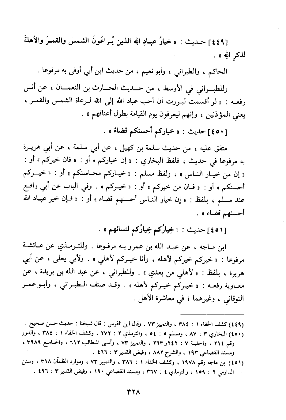 451 - حَدِيث: خِيَارُكُمْ خِيَارُكُمْ لِنِسَائِهِمْ، ابن ماجه عن عبد اللَّه بن عمرو به مرفوعا، وللترمذي عن عائشة مرفوعا: خيركم خيركم لأهله، وأنا خيركم لأهلي، ولأبي يعلى عن أبي هريرة بلفظ: لأهلي من بعدي، وللطبراني عن عبد اللَّه بن بريدة عن معاوية رفعه: خيركم خيركم لأهله، وقد صنف الطبراني وأبو عمر النوقاني وغيرهما في معاشرة الأهل.