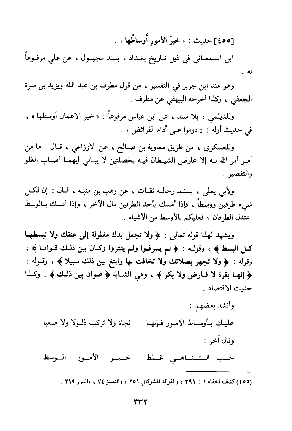 455 - حديث: خَيْرُ الأُمُورِ أَوْسَاطُهَا، ابن السمعاني في ذيل تاريخ بغداد بسند مجهول عن علي مرفوعا به، وهو عند ابن جرير في التفسير من قول مطرف بن عبد اللَّه ويزيد بن مرة الجعفي، وكذا أخرجه البيهقي عن مطرف، وللديلمي بلا سند عن ابن عباس مرفوعا: خير الأعمال أوسطها، في حديث أوله: داوموا على أداء الفرائض، وللعسكري من طريق معاوية بن صالح عن الأوزاعي قال: ما من أمر أمر اللَّه به إلا عارض الشيطان فيه بخصلتين لا يبالي أيهما أصاب الغلو والتقصير، ولأبي يعلى بسند رجاله ثقات عن وهب بن منبه قال: إن لكل شيء طرفين ووسطا، فإذا أمسك بأحد الطرفين مال الآخر، وإذا أمسك بالوسط اعتدل الطرفان، فعليكم بالأوسط من الأشياء، ويشهد لهذا كله قوله تعالى: {وَلا تَجْعَلْ يَدَكَ مَغْلُولَةً إِلَى عُنُقِكَ وَلا تَبْسُطْهَا كُلَّ الْبَسْطِ} وقوله: {لَمْ يُسْرِفُوا وَلَمْ يَقْتُرُوا وَكَانَ بَيْنَ ذَلِكَ قَوَامًا} وقوله {وَلا تَجْهَرْ بِصَلاتِكَ وَلا تُخَافِتْ بِهَا وَابْتَغِ بَيْنَ ذَلِكَ سَبِيلا} وقوله: {إِنَّهَا بَقَرَةٌ لا فَارِضٌ وَلا بِكْرٌ} وهي الشابة {عَوَانٌ بَيْنَ ذَلِكَ} وكذا حديث الاقتصاد، وأنشد بعضهم: