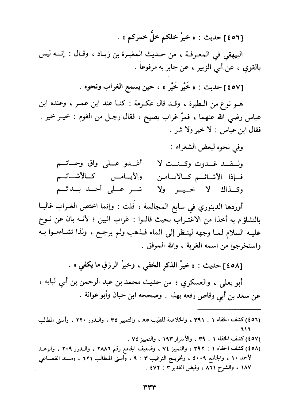 457 - حَدِيث: خَيْرٌ خَيْرٌ، حِينَ يُسْمَعُ الْغُرَابُ وَنَحْوُهُ، هُوَ نَوْعٌ مِنَ الطِّيَرَةِ، وَقَدْ قَالَ عِكْرِمَةُ: كُنَّا عِنْدَ ابْنِ عُمَرَ وَعِنْدَهُ ابْنُ عَبَّاسٍ رَضِيَ اللَّه عَنْهُمَا، فَمَرَّ غُرَابٌ يَصِيحُ فَقَالَ رَجُلٌ مِنَ الْقَوْمِ: خَيْرٌ خَيْرٌ، فَقَالَ ابْنُ عَبَّاسٍ: لا خَيْرَ وَلا شَرَّ، وَفِي نَحْوِهِ لِبَعْضِ الشُّعَرَاءِ: