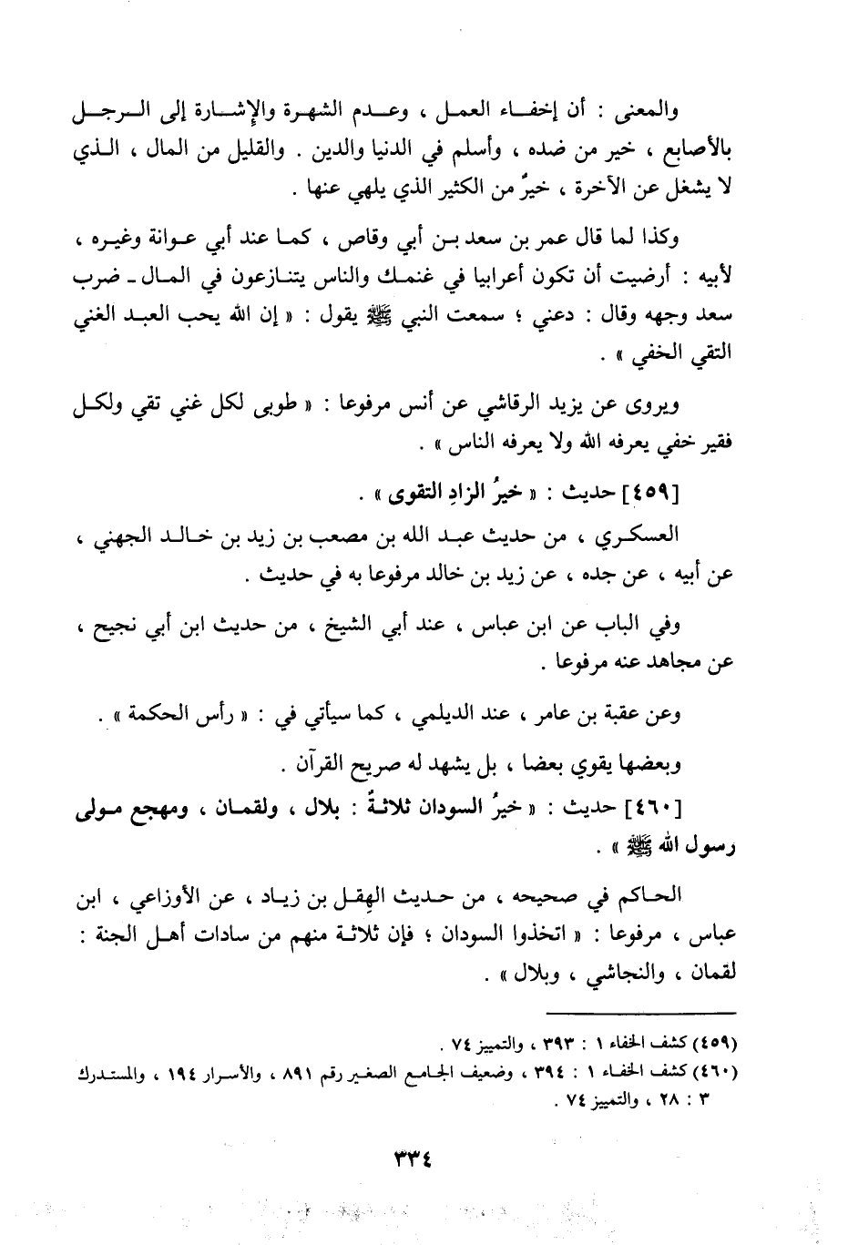 460 - حَدِيث: خَيْرُ السُّودَانِ ثَلاثَةٌ بِلالٌ وَلُقْمَانُ وَمِهْجَعٌ مَوْلَى رَسُولِ اللَّه صَلَّى اللَّهُ عَلَيْهِ وَسَلَّمَ، الحاكم في صحيحه من حديث الهِقل بن زياد عن الأوزاعي حدثني أبو عمار عن واثلة بن الأسقع مرفوعا به، وللطبراني من رواية عطاء عن ابن عباس مرفوعا: اتخذوا السودان فإن ثلاثة منهم من سادات أهل الجنة لقمان والنجاشي وبلال،