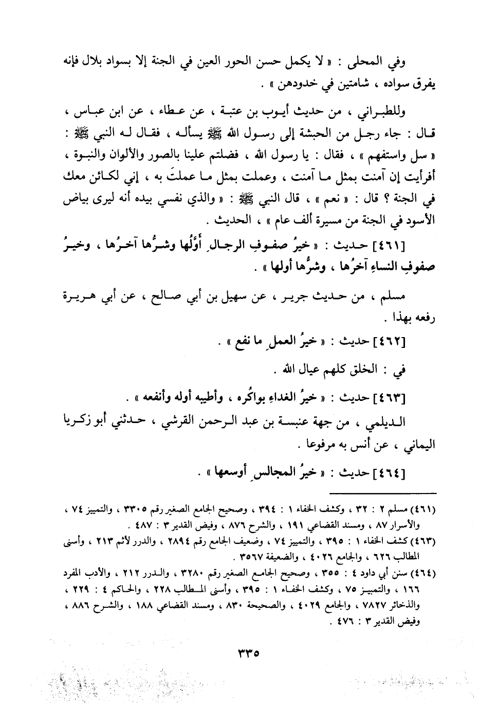 وفي المحلى: لا يكمل حسن الحور العين في الجنة إلا بسواد بلال، فإنه يفرق سواده، شامتين في خدودهن، وللطبراني من حديث أيوب بن عتبة عن عطاء عن ابن عباس قال: جاء رجل من الحبشة إلى رسول اللَّه صَلَّى اللَّهُ عَلَيْهِ وَسَلَّمَ يسأله، فقال له النبي صَلَّى اللَّهُ عَلَيْهِ وَسَلَّمَ: سل واستفهم، فقال: يا رسول اللَّه، فضلتم علينا بالصور والألوان والنبوة، أفرأيت إن آمنت بمثل ما آمنت، وعملت بمثل ما عملتَ به، إني لكائن معك في الجنة؟ قال: نعم، قال النبي صَلَّى اللَّهُ عَلَيْهِ وَسَلَّمَ: والذي نفسي بيده إنه ليرى بياض الأسود في الجنة من مسيرة ألف عام، الحديث.
