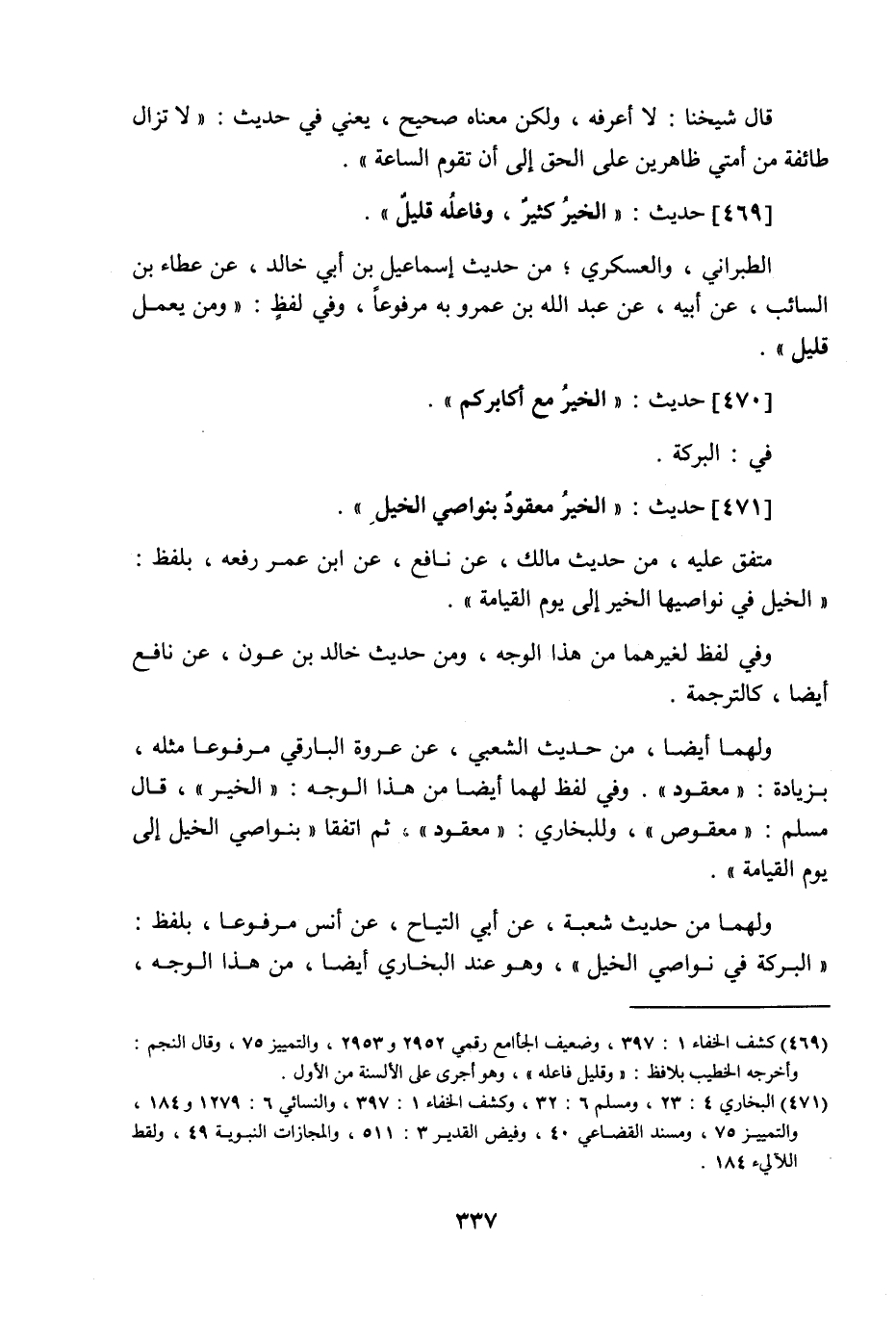 471 - حَدِيث: الْخَيْرُ مَعْقُودٌ بِنَوَاصِي الْخَيْلِ، متفق عليه من حديث مالك، عن نافع عن ابن عمر رفعه بلفظ: الخيل في نواصيها الخير إلى يوم القيامة، وفي لفظ لغيرهما من هذا الوجه، ومن حديث خالد بن عون عن نافع أيضا، كالترجمة، ولهما أيضا من حديث الشعبي عن عروة البارقي مرفوعا مثله بزيادة: معقود، وفي لفظ لهما أيضا من هذا الوجه: الخير، قال مسلم: معقوص، وللبخاري: معقود، ثم اتفقا بنواصي الخيل إلى يوم القيامة، ولهما من حديث شعبة عن أبي التياح، عن أنس مرفوعا، بلفظ: البركة في نواصي الخيل، وهو عند البخاري أيضا، من هذا الوجه،
