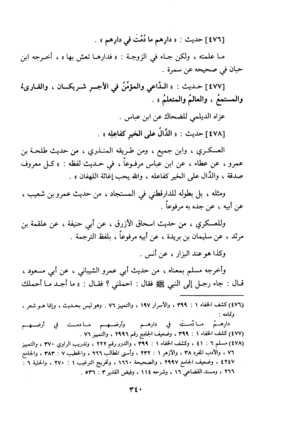 478 - حَدِيث: الدَّالُّ عَلَى الْخَيْرِ كَفَاعِلِهِ، الْعَسْكَرِيُّ وَابْنُ جُمَيْعٍ، وَمِنْ طَرِيقِهِ الْمُنْذِرِيُّ مِنْ حَدِيثِ طَلْحَةَ بْنِ عَمْرٍو، عَنْ عَطَاءٍ عَنِ ابْنِ عَبَّاسٍ مَرْفُوعًا، فِي حَدِيثٍ لَفْظُهُ: كُلُّ مَعْرُوفٍ صَدَقَةٌ، والدَّال عَلَى الْخَيْرِ كَفَاعِلِهِ، واللَّه يُحِبُّ إِغَاثَةَ اللَّهفان، ومثله، بل بطوله للدارقطني في المستجاد من حديث عمرو بن شعيب، عن أبيه، عن جده به مرفوعا، وللعسكري من حديث إسحاق الأزرق، عن أبي حنيفة عن علقمة بن مرثد، عن سليمان بن بريدة، عن أبيه مرفوعا، بلفظ الترجمة، وكذا هو عند البزار عن أنس، وأخرجه مسلم بمعناه من حديث أبي عمرو الشيباني، عن أبي مسعود، قال: جاء رجل إلى النبي صَلَّى اللَّهُ عَلَيْهِ وَسَلَّمَ فقال: احملني، فقال: ما أجد ما أحملك